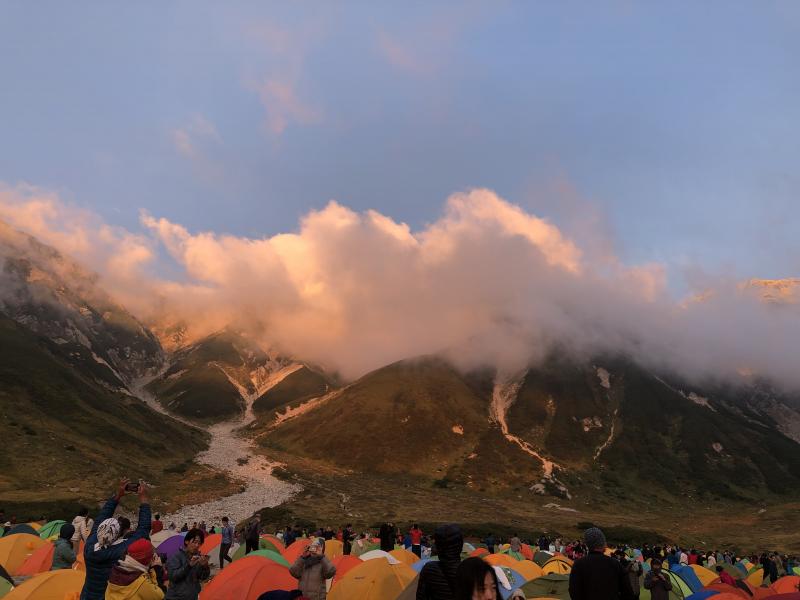 ・9月20日夕方の雷鳥平キャンプ場は956張のテント。例年のピーク時は600張程度なのでとても混雑していました。20日17時半ごろに隣にテントを張った方にきいたところ、9月20日11時に立山駅駐車場に着いてケーブルカーに乗車できたのが15時だったとのことです。