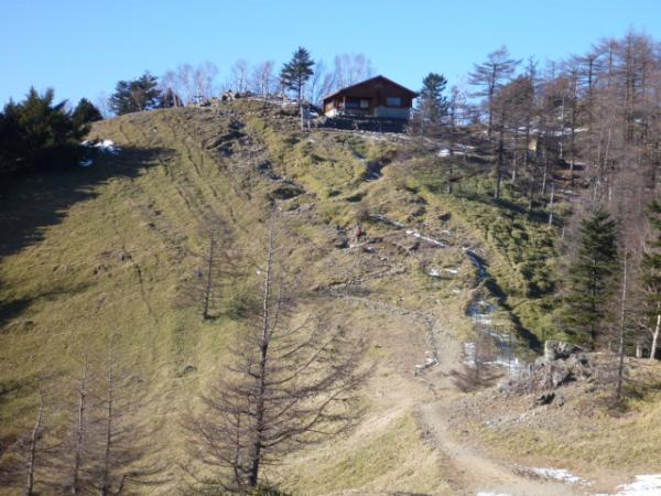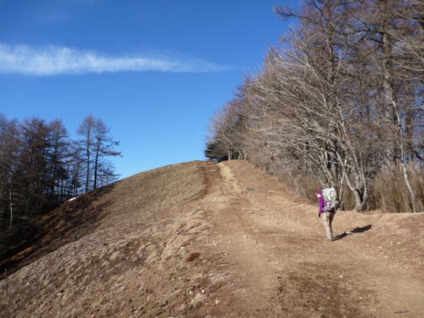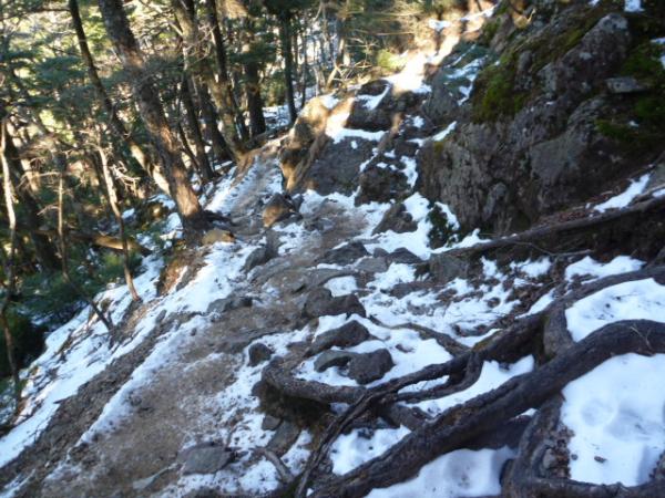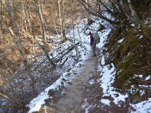この時期はまだほとんど雪はなく全体的に難しい部分はないです。しかしながら、登山道は凍っている部分も少なくはなく6本爪は必携です。