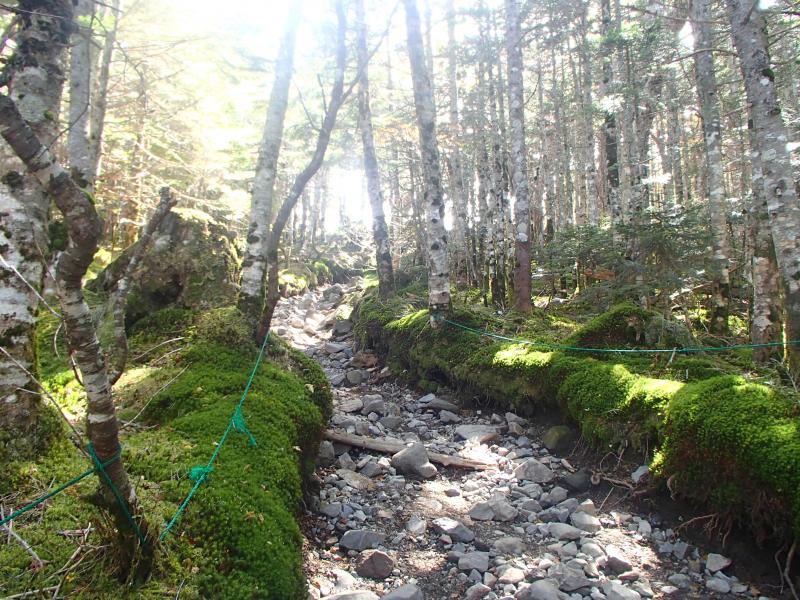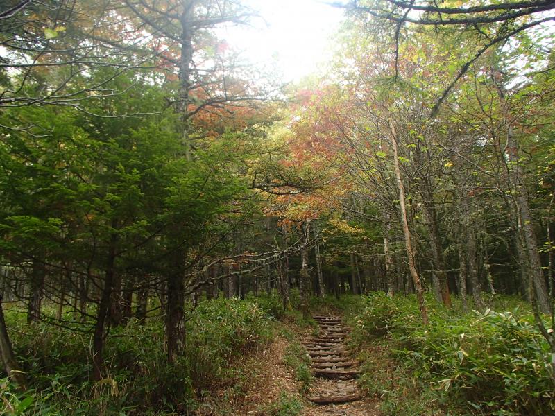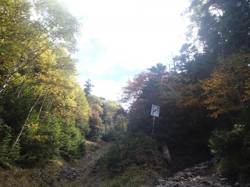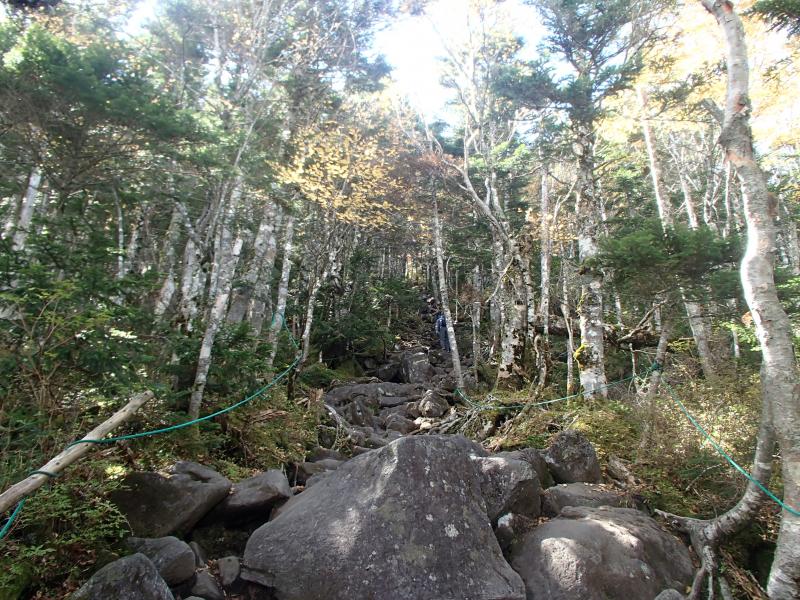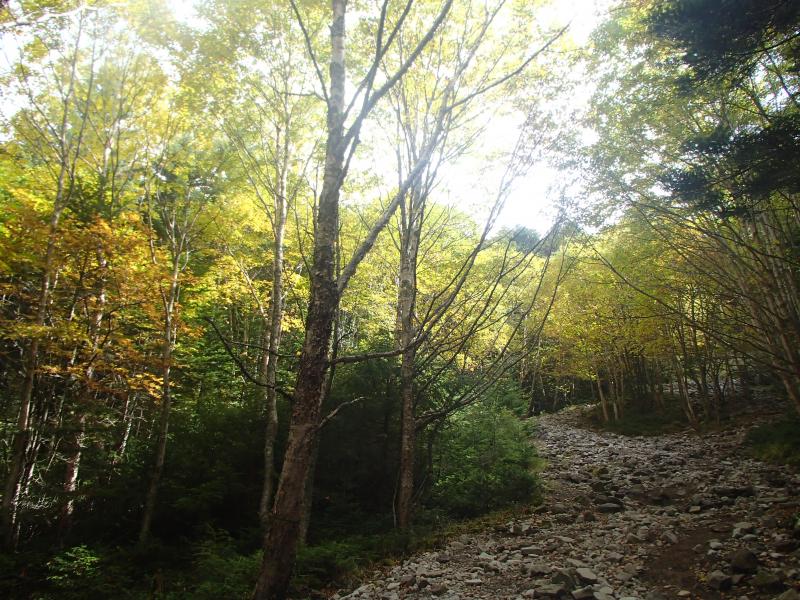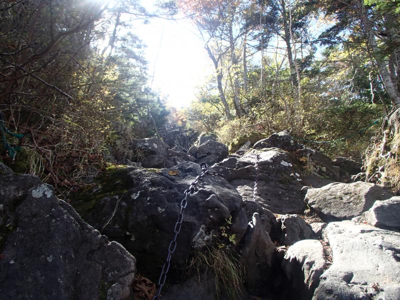 ・青息吐息になりながら歩いていると、急激に雲が流れ始め、一気に青空が広がってきました。「うぉぉ~!!」「きたぁ~!!!」と心の中で歓喜の叫び!一気に眠気まで飛び去って行きます。陽の光に照らされた樹々の緑と紅と黄が美しく、疲れも癒されます。それでもガレの登りは結構長いです・・・。足元には注意して下さい。