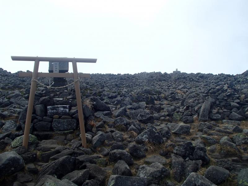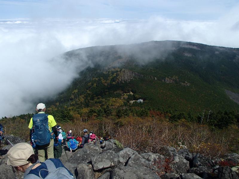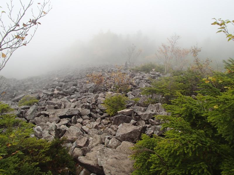 ・前方に登りでは立ち寄らなかった「天狗の露地」が見えてきたので立ち寄ってみる。ところがさっきまでバッチリ晴れていたのに、一気にガスってしまい、なぁ~んも見えません・・・。山頂が晴れてくれていて本当に良かった。