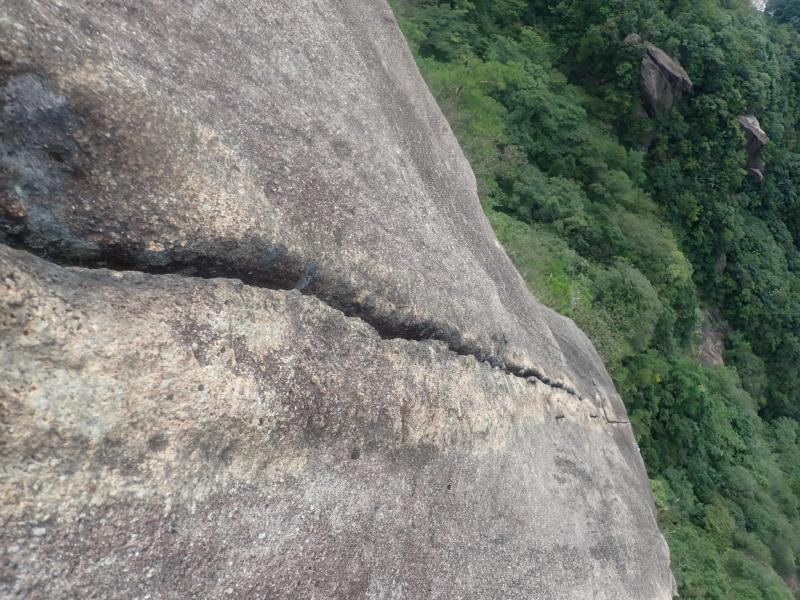 一枚のスラブ(といっても傾斜はかなり強い)にフィンガーサイズのクラックがハング下まで続いている形状は、とても美しい。