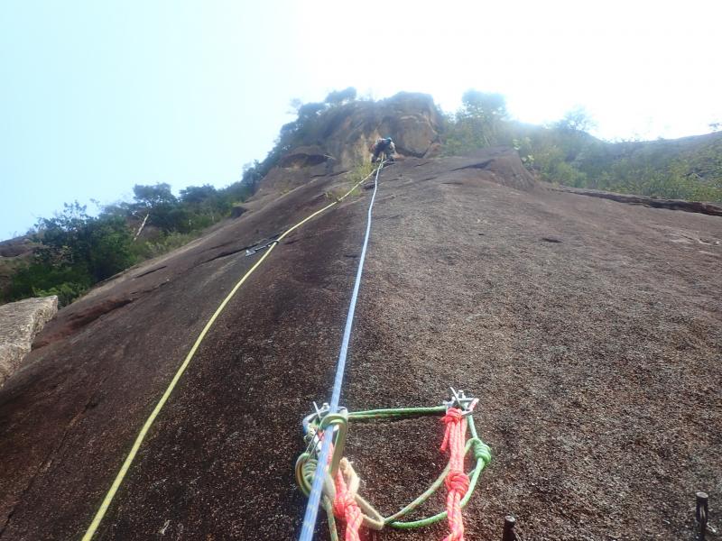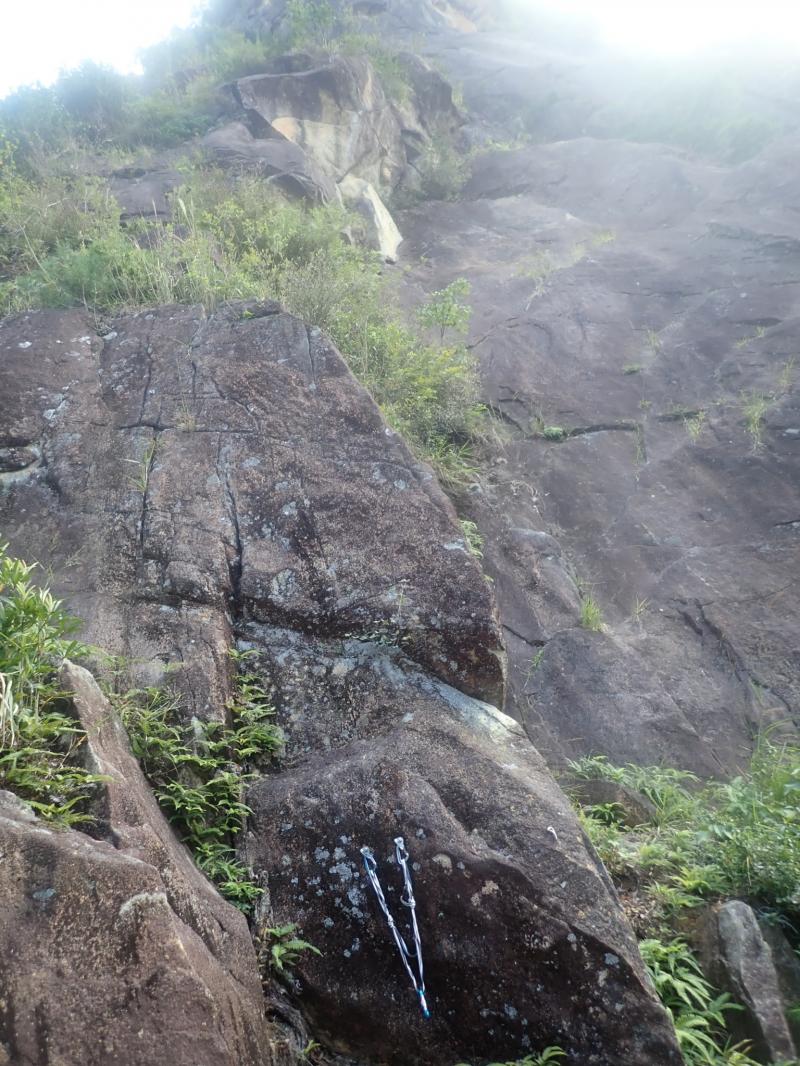そのクラックの横には、ピトンとハンガーが打たれているわけだが、おそらく瑞牆あたりだとそれらの残置物はあっという間に抜かれてしまうだろう。