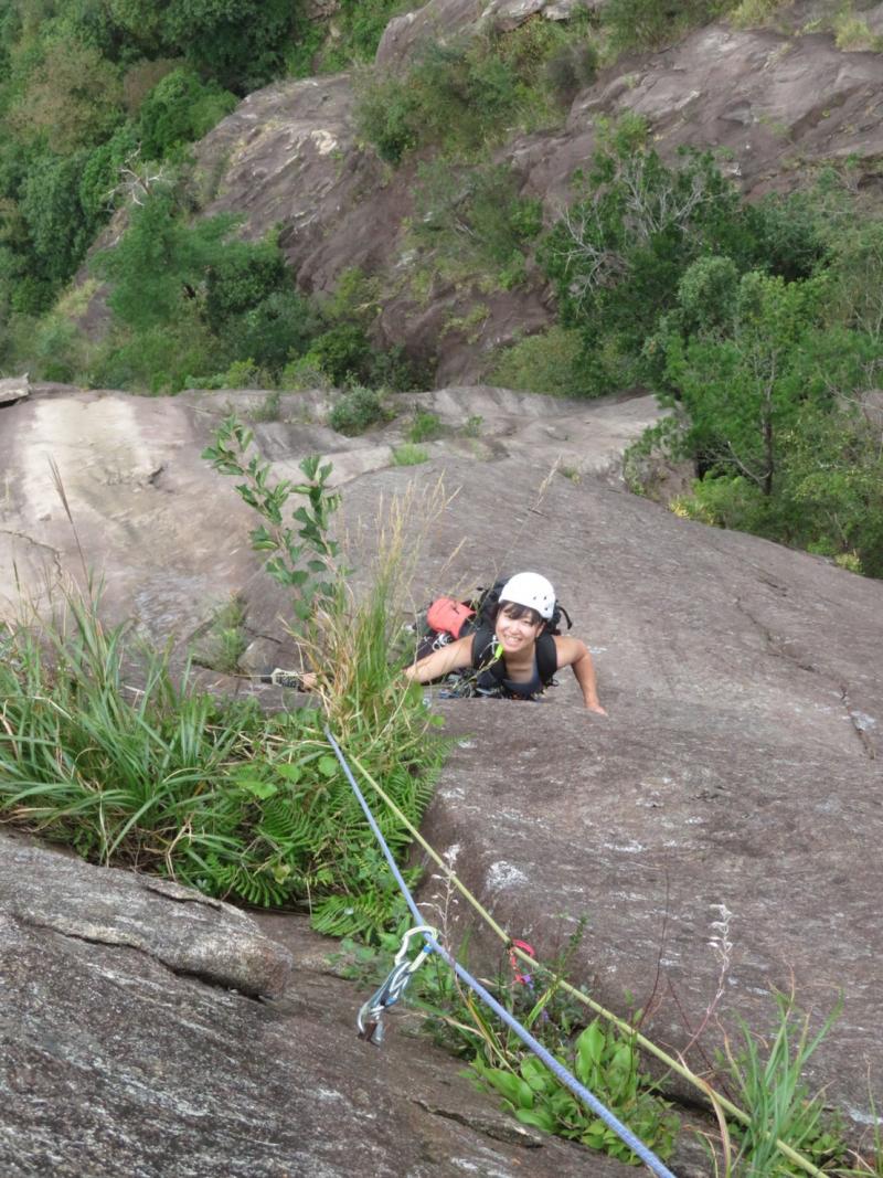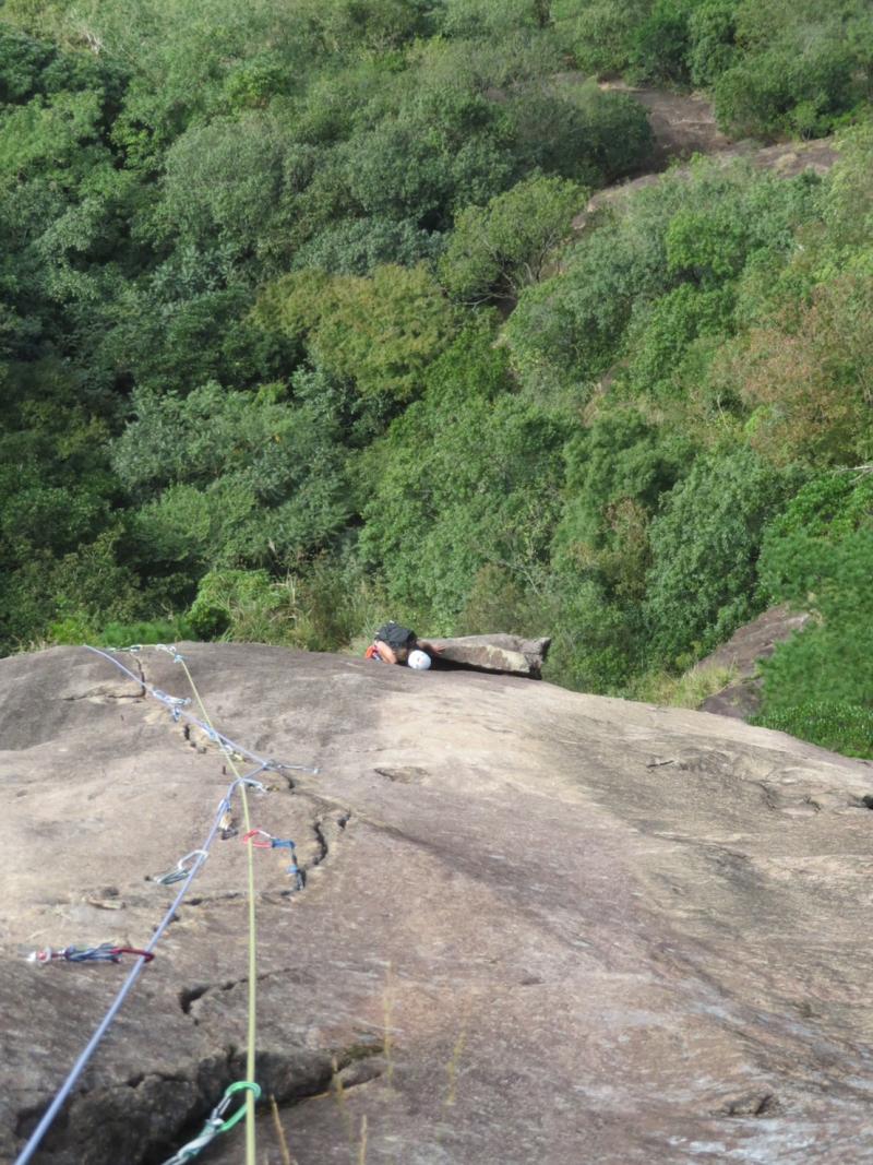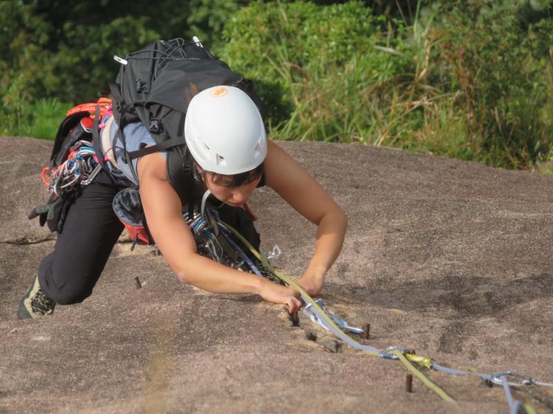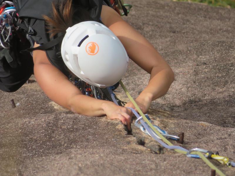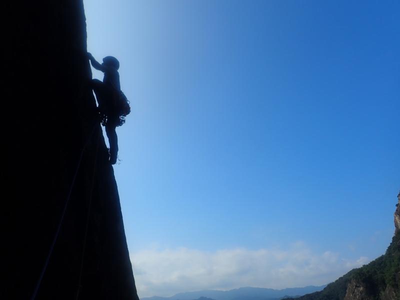 ビレイ点からは、核心部の様子が見えないため、より慎重に登らなければならない場面だ。