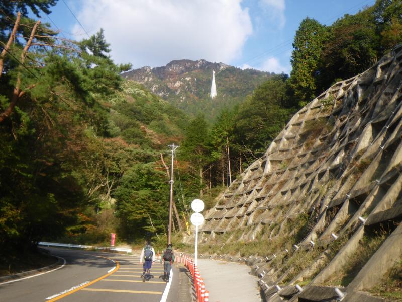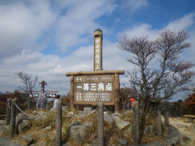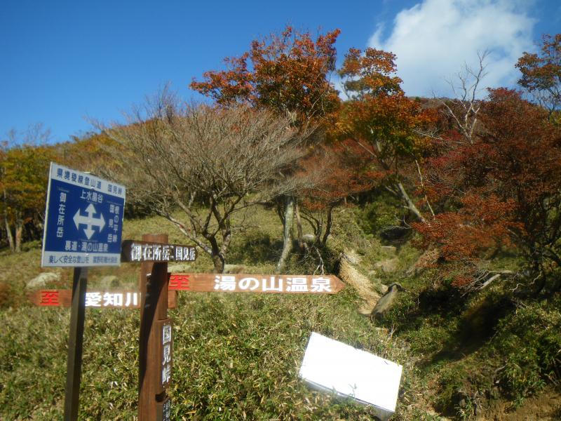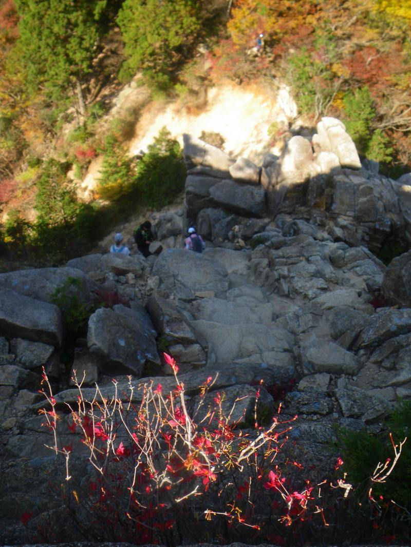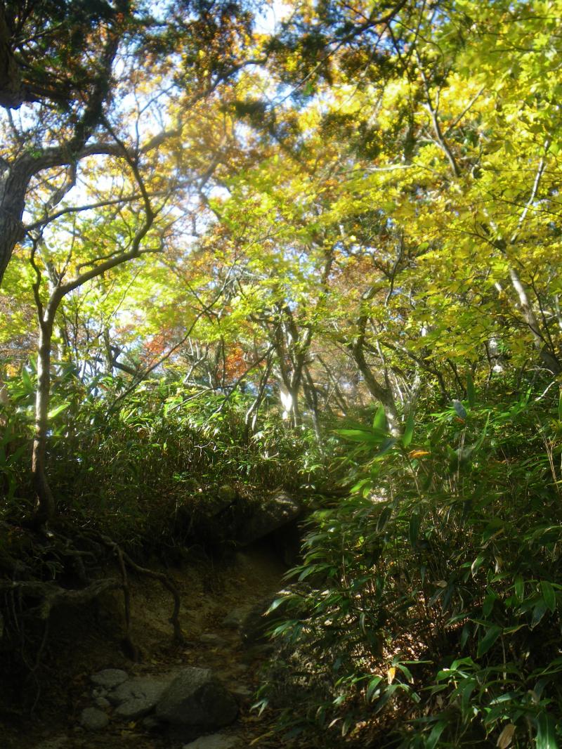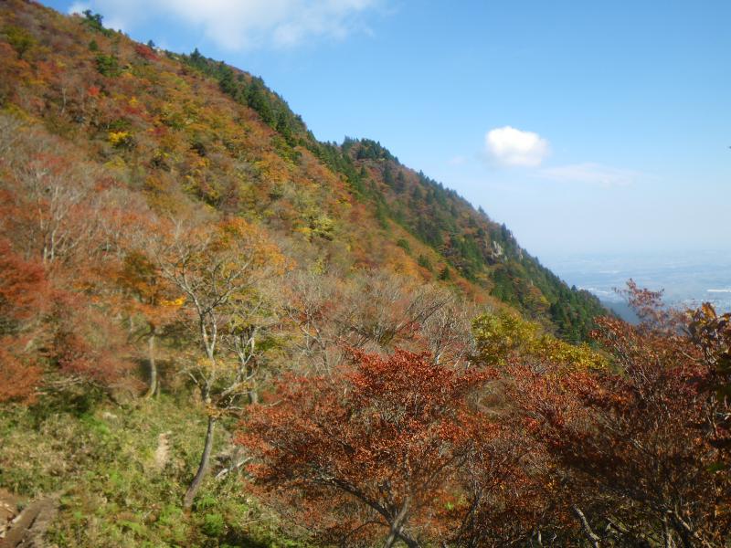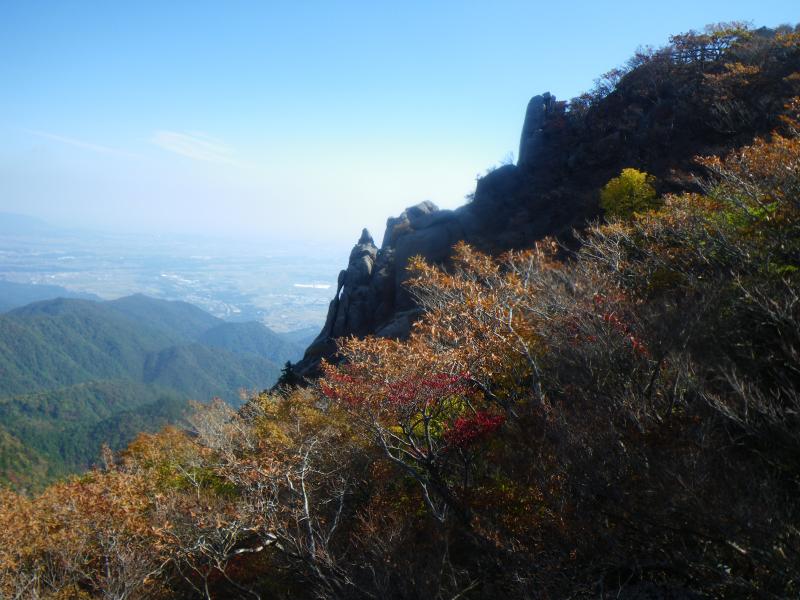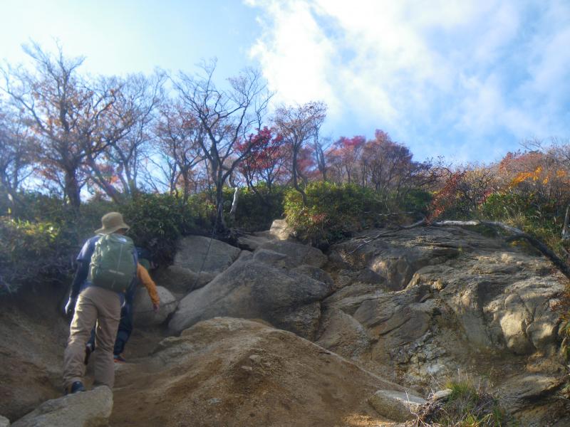 今回は紅葉を求めて、メジャーな中道から登り、裏道で下るコースを選択し、昼過ぎに終える計画をしました。この時期の駐車場は平日でも朝早く、行かないと満車になりますから、6時台に向かいました。今日は出発する7時前にはどんどん車が入ってくる状態でしたが、まだ埋まらずといった感じでした。人気ルートの中道ですが、鈴鹿特有の溝のような道から始まり、あばれ岩・地蔵岩などの岩峰を巻き、キレットの下り、岩峰の鎖トラバースと見所いっぱいでなんだか楽しくなる登山道で、私も好きな登山道です。中道はキレットから上でやや紅葉していて、8・9合目がきれいな感じですが、中道自体は紅葉する樹木が少ないです。逆に山上公園では枯れた樹木も目立ちますが、富士見岩展望台から下へ覗き込むと周辺がきれいに紅葉していました。この頃から風がいくぶん、強くなり、肌寒さを感じました。山頂まで往復してきましたが、観光客も登山客も平日でもかなり賑わっていました。帰りは裏道を使いますが、逆にこちらは紅葉真っ盛りで、6合~8合あたりが見頃で、黄色・赤色・黄緑色と鮮やかでした。久々に裏道を通りますが、中道に比べて、樹林帯の中が多く、岩場などはありませんので面白みがかけ長く感じると思います。