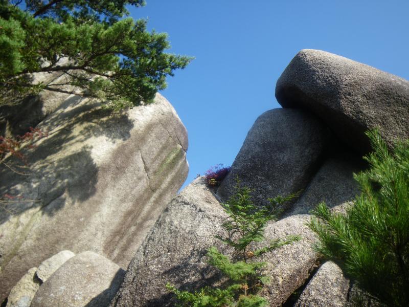 ➃4合目のあばれ岩、5合目過ぎで地蔵岩と撮影スポットが続き、6合目でキレットの下り(鎖あり)、7合目でかもしか広場、8合目で岩峰トラバース(鎖あり)と続きます。他にも木や鉄の梯子部分があります。