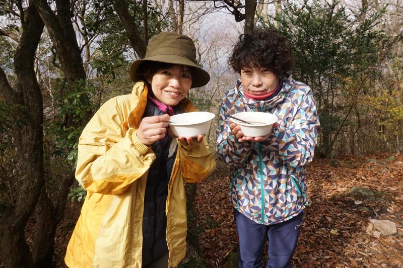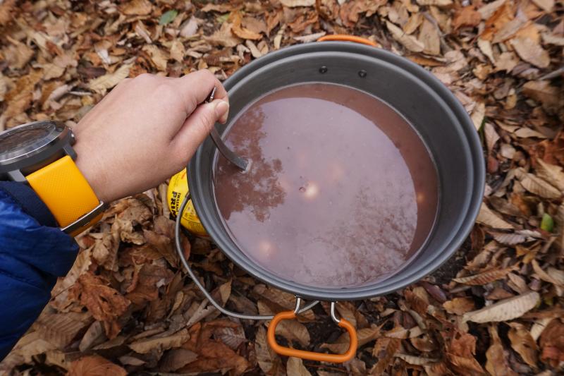 山カフェということで、麻衣子ガイドと一緒に大きなお鍋でおしるこを作りました。
