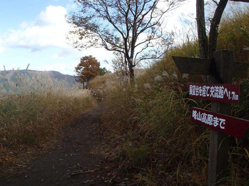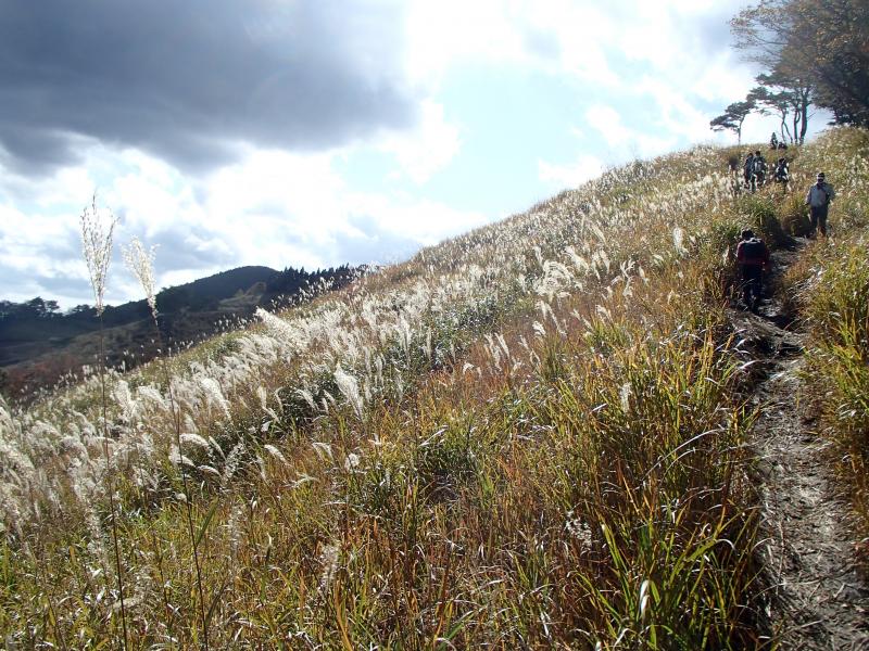 ・樹林の中の短い階段の登りを抜けると一気に展望がひらけ、眼下にススキ野原が広がる素晴らしい景観が得られます!ここから展望を楽しみながらちょっと細めの急坂を峰山高原分岐まで登ります。