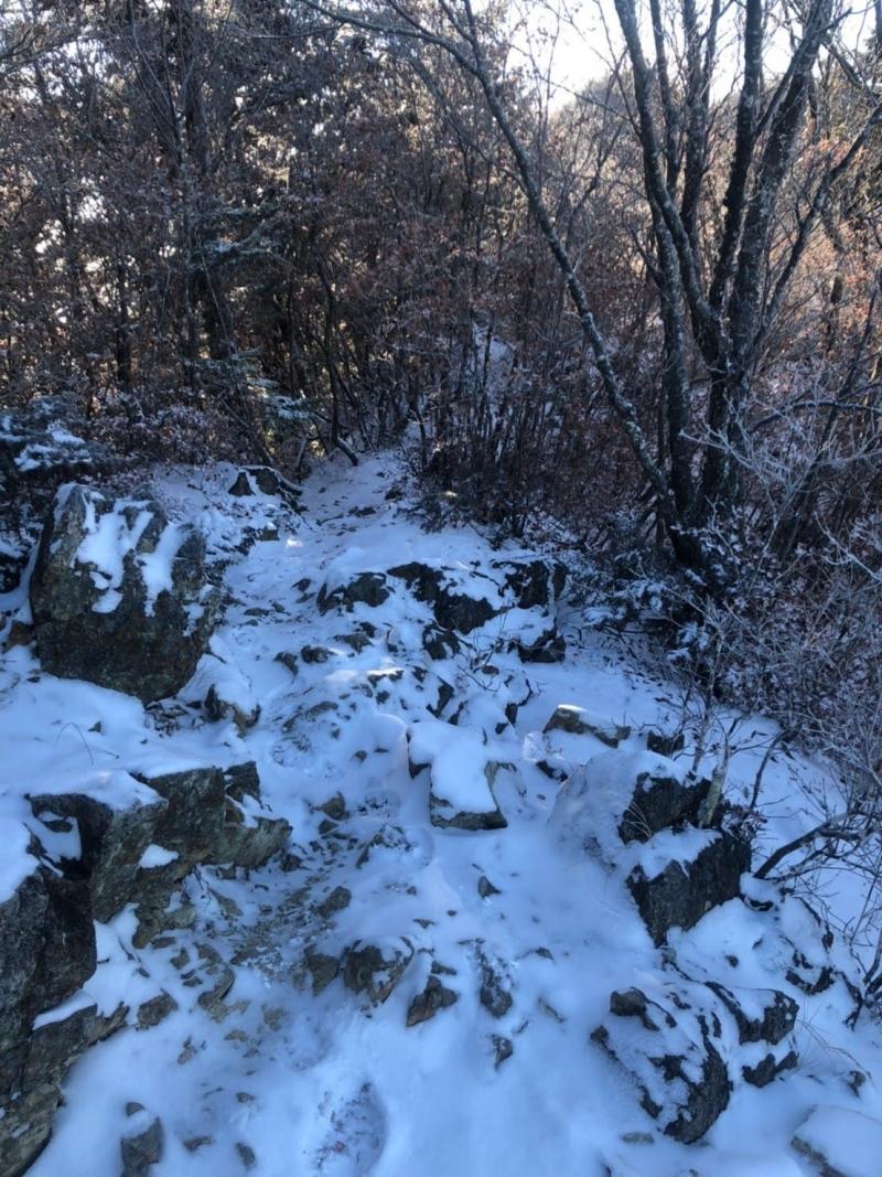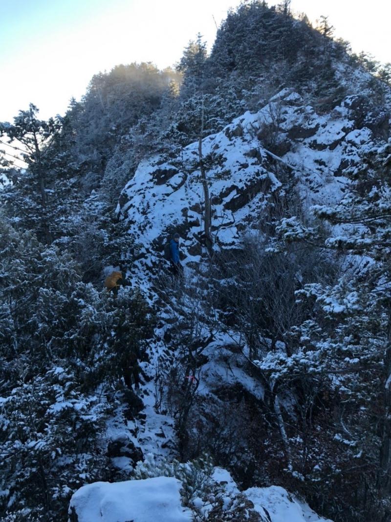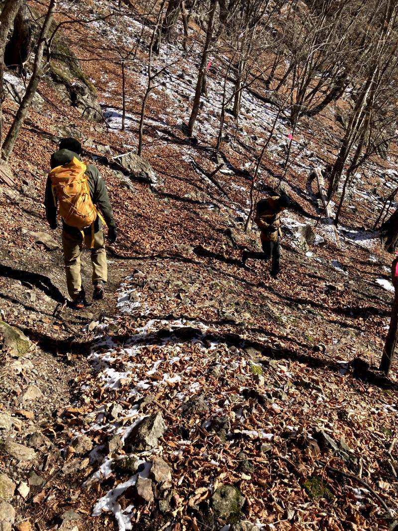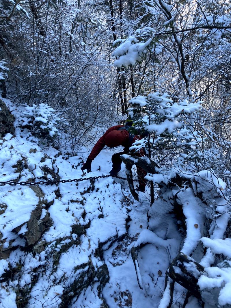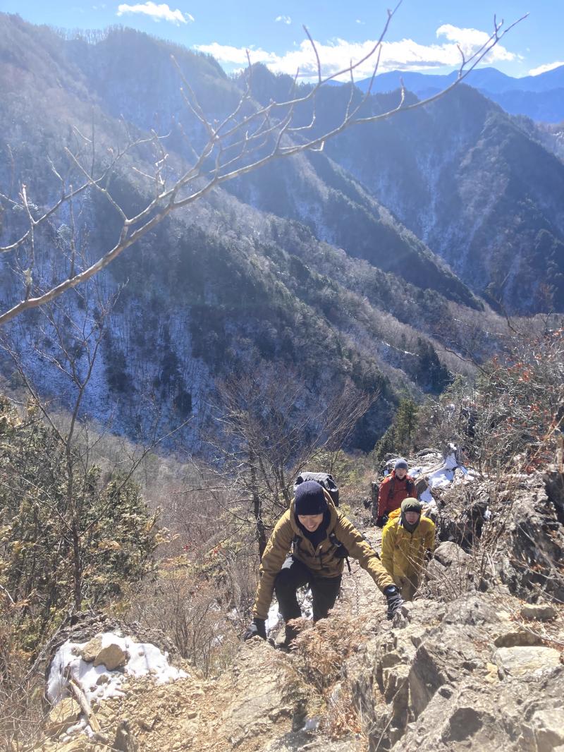 コース全体に、前日に降ったと思われる雪がありました。特に西岳から東岳の間の岩場、鎖場に雪が付いていて厳しい状況です。細かいホールドが分かりにくく、凍ってる所もあり滑りました。