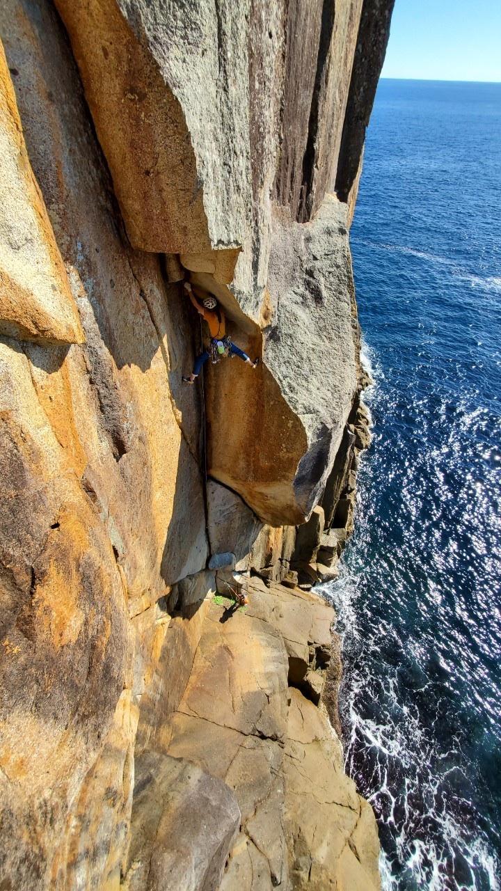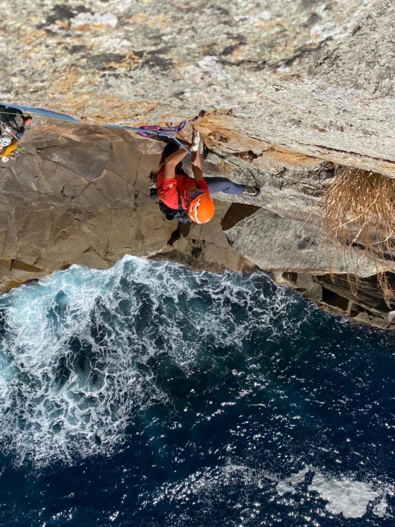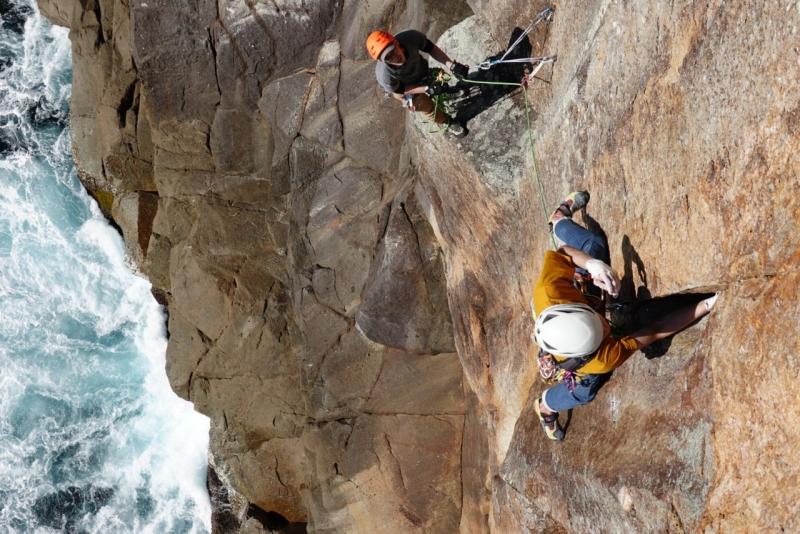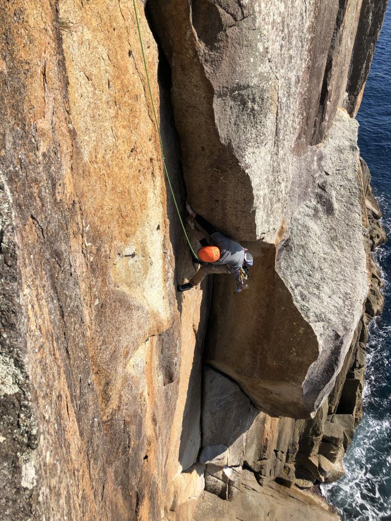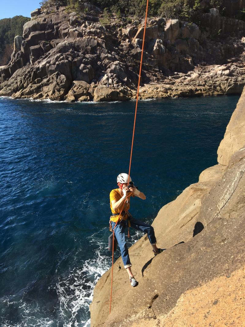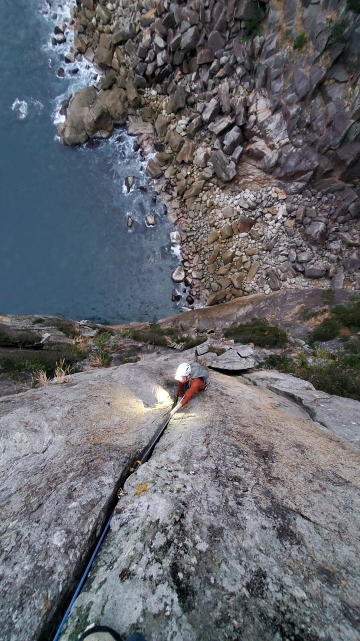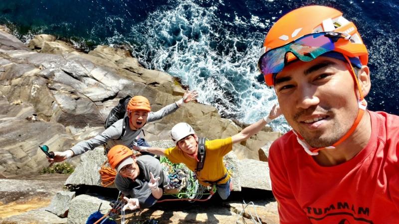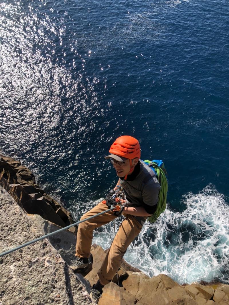 最後の懸垂はそのまま鉛直方向に降りると海なので、波打ち際あたりから左に大きくスウィングして取り付きへ。