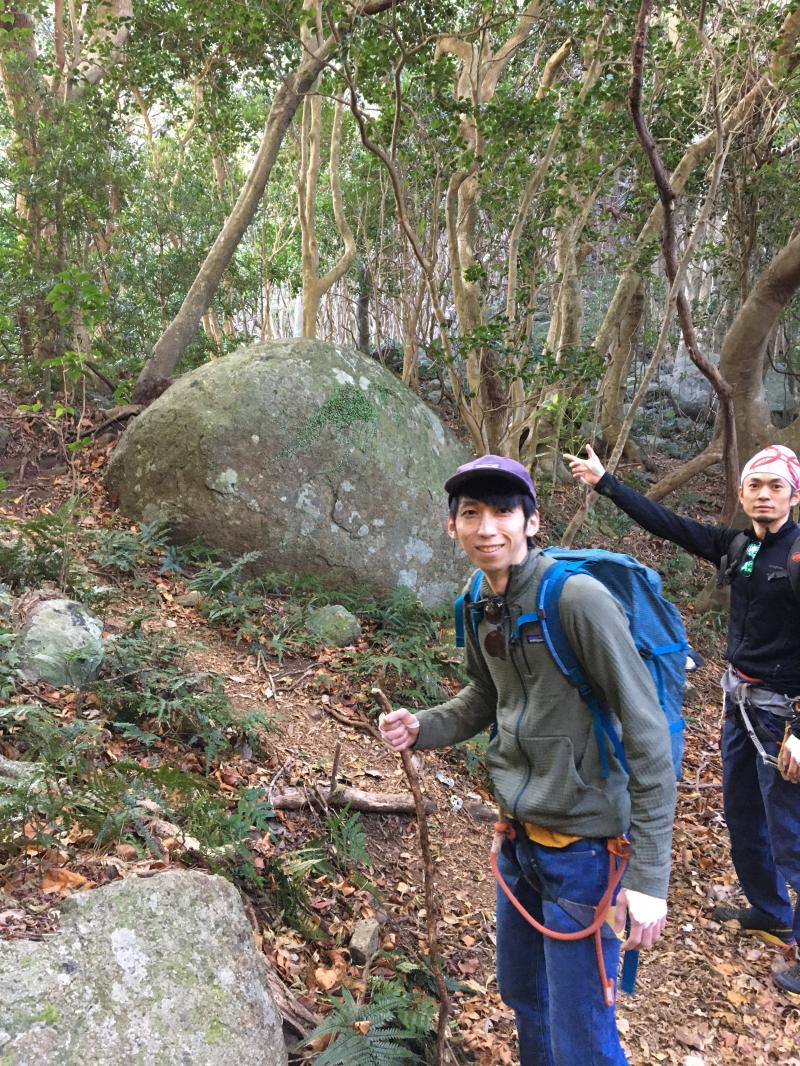 楯ヶ崎へと続くトレイルを駐車場から5分ほど下るとムツミヤ山へと向かう踏み跡が左手の方に出てくる。目印は丸っこい岩(写真参照)。