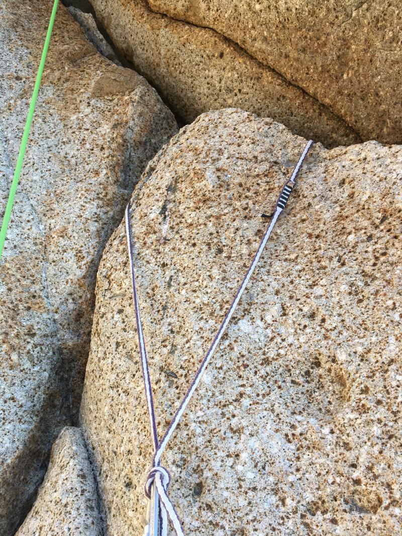 2P目の終了点は巨大フレークに巻かれている残置コード(カラビナ3つ残置あり)。
