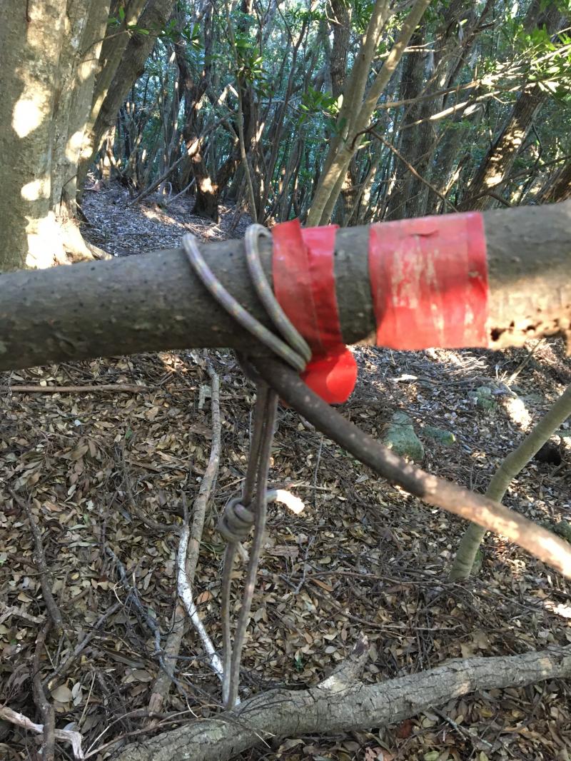 頂稜に着いたら、東側に向かって少し歩くと、下りに差しかかる手前の倒木に赤テープが巻いてある(写真参照)。これが目印で、斜面側に進むとさらに杖サイズの木の枝が地面に刺さっておりそれにも赤テープが巻いてある。