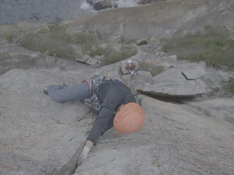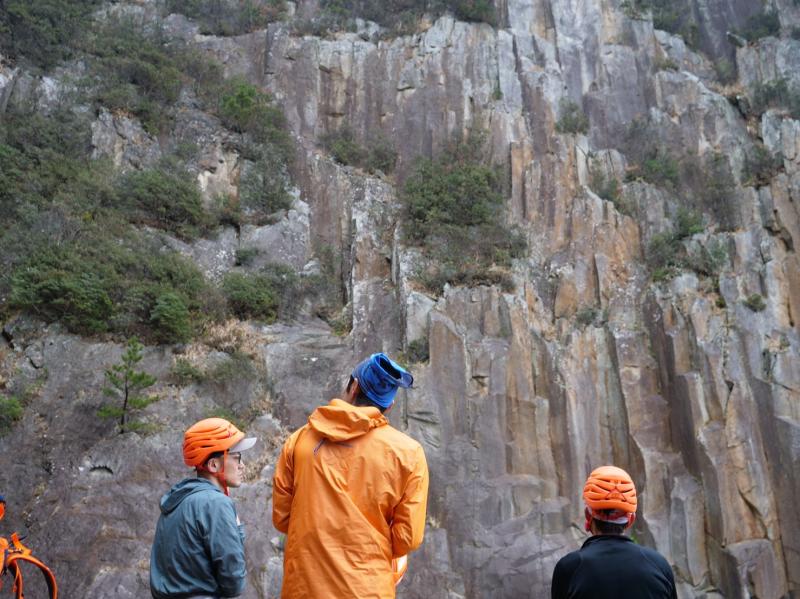取り付きにはビレイステーションがなく、下地もあまり良くないので、フレークにスリングを巻くかカムで作成する。