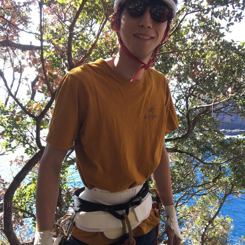 ルートを登り切った後は、そのまま上に抜けることもできるようですが懸垂で降りました。50mロープ2本を繋いで2回。3P目終了点→2P目終了点→海。
