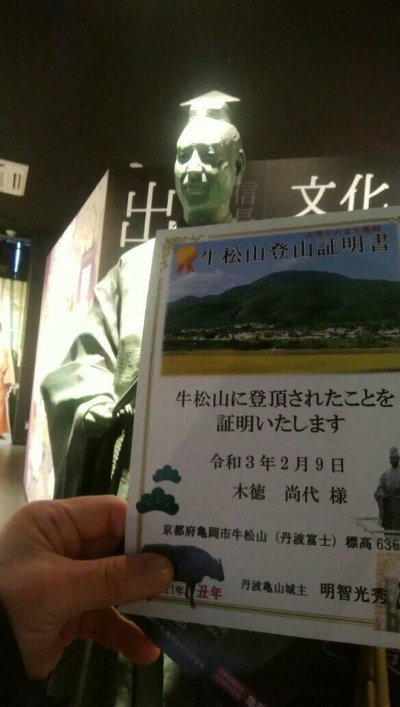 2021年1月1日(金曜日)から牛松山山頂に設置の登頂記念看板をスマホなどで撮影し、「麒麟がくる 京都亀岡大河ドラマ館(亀岡市追分町サンガスタジアム」の受付で特別の「牛松山登山証明書」を頂けます。ドラマ館入場も2割引きです。