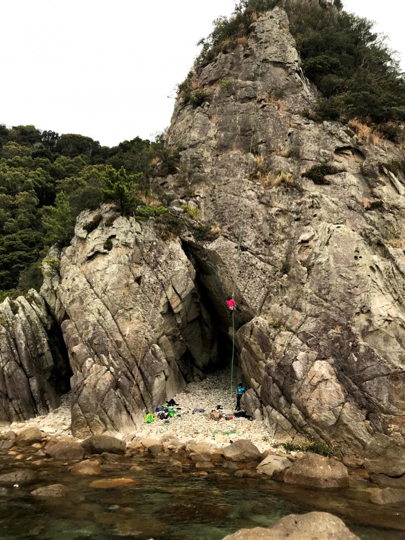 5m程下りると岩の先端にきたが、上からぶら下がっていると目指す方向が全然わからない。下から眺めるのとでは全く様子が違うから、すごく難しい。