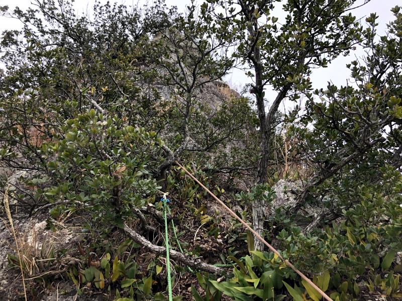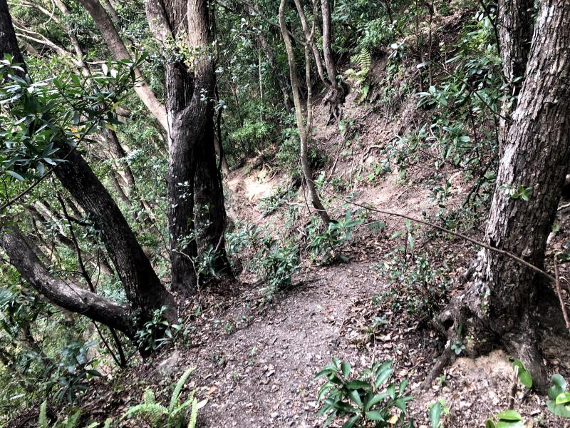 まずは濃い藪を越えて頂上まで行けるのか不安があったが、行ってみるとまるで人間が通ったような踏み跡がみられた。