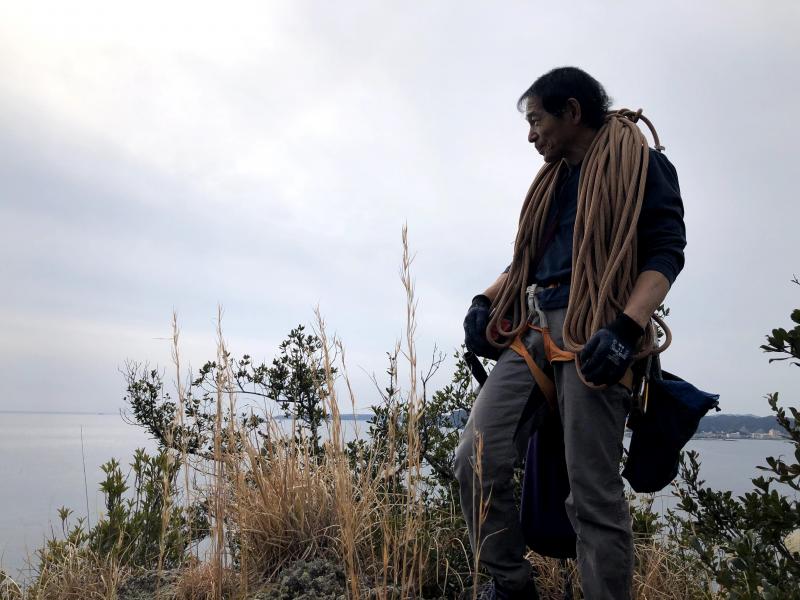 頂上まで登ると、直径5cmほどの立ち木を支点に東さんが懸垂をはじめた。