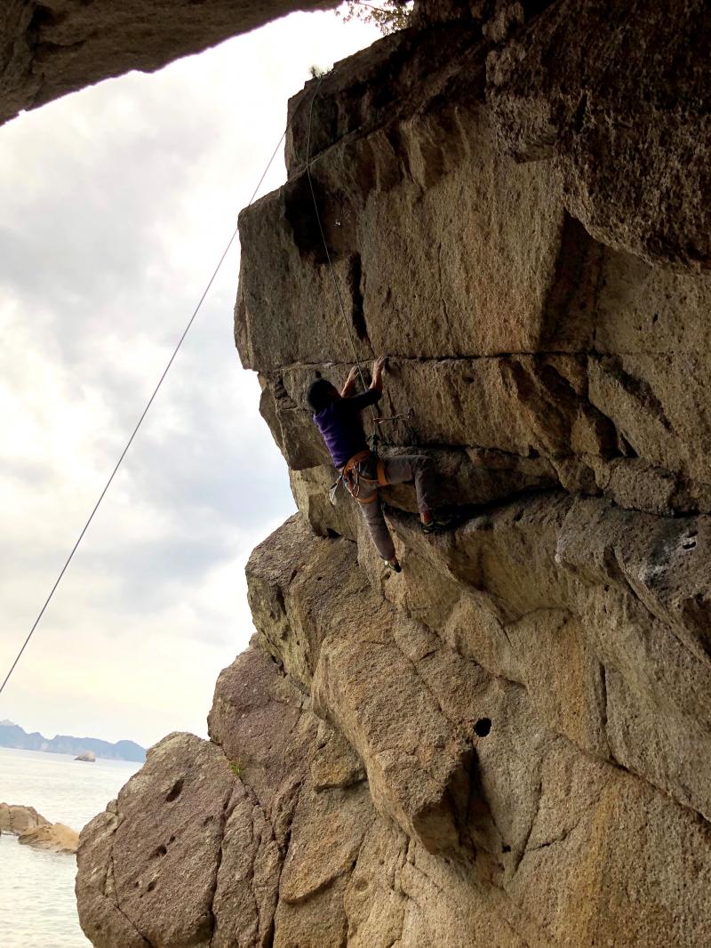 ボルトを打ちすすめていくと、向かって右側にルートをつくるつもりが、先日Mさんが初登したルートに合流するようなかたちとなった。