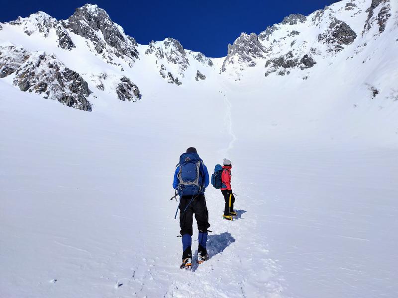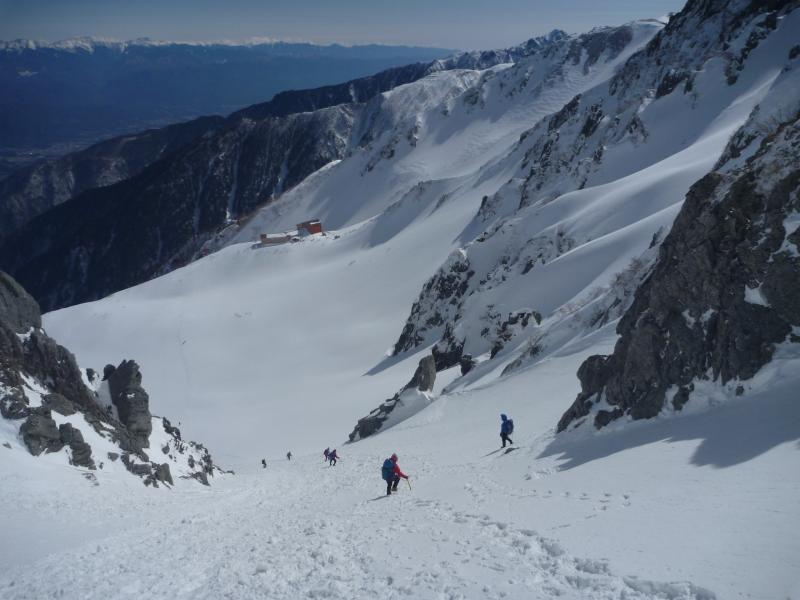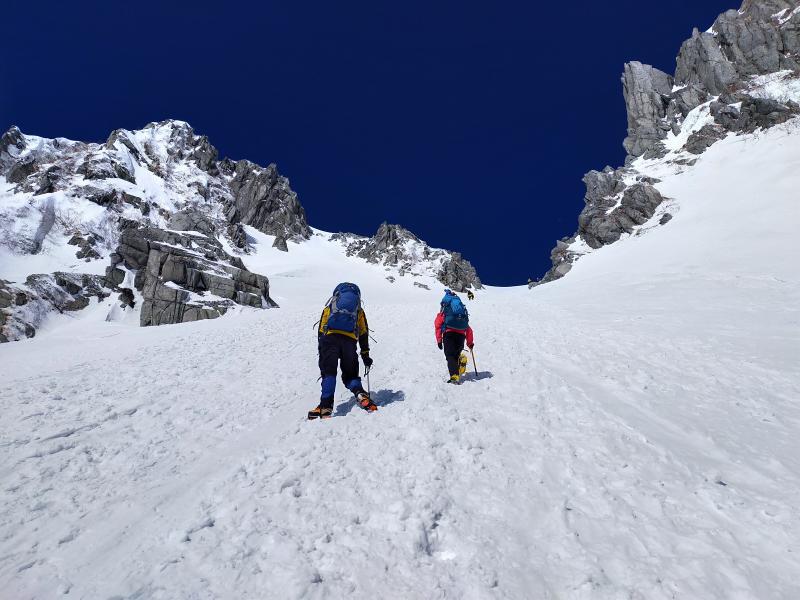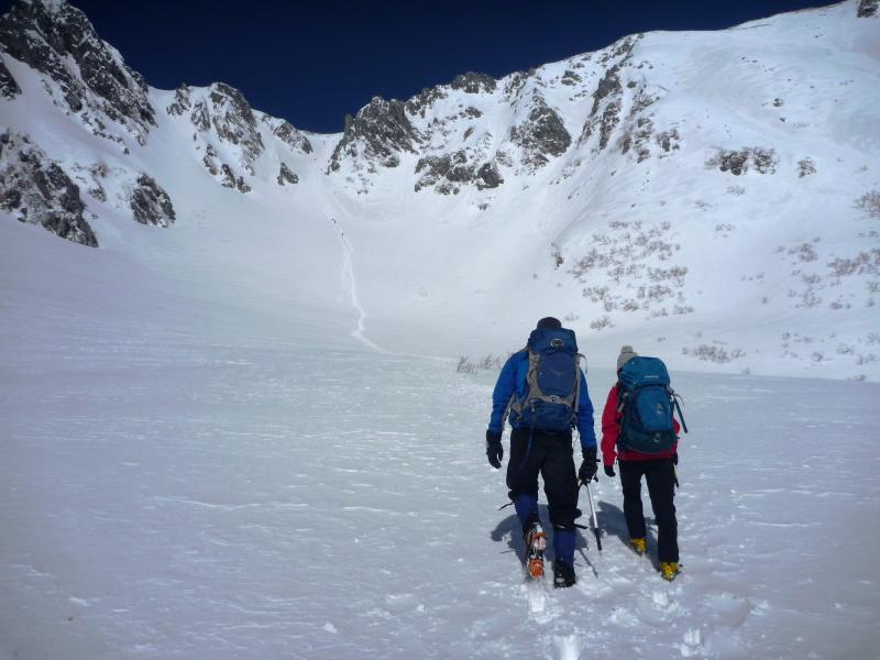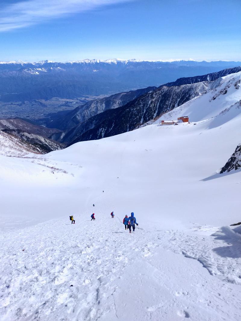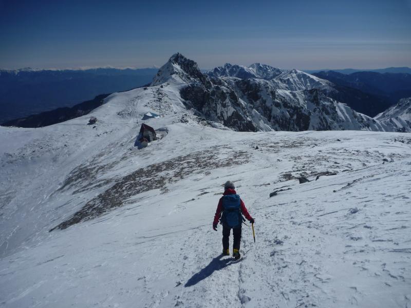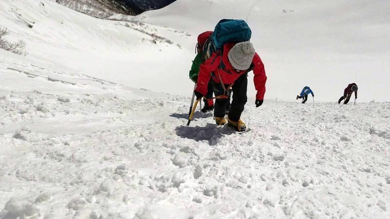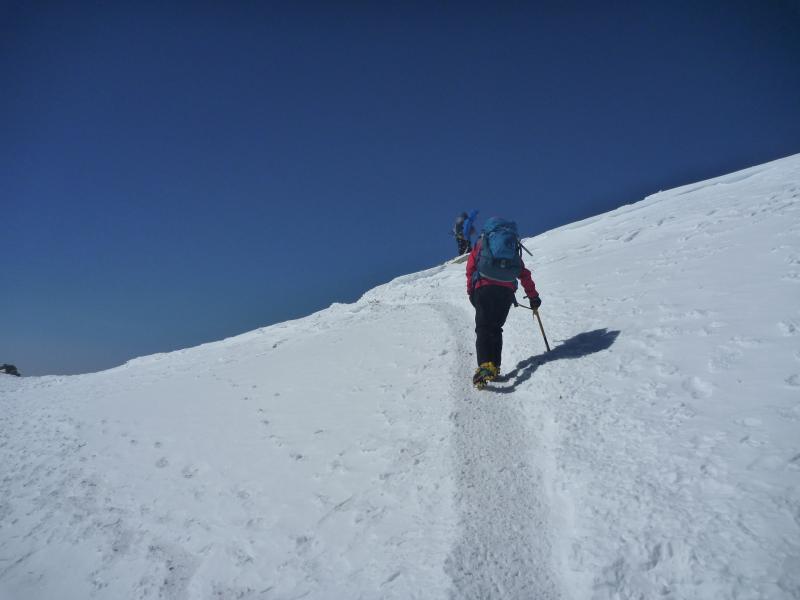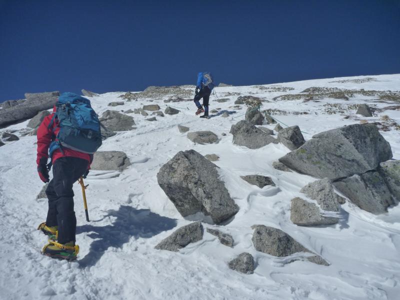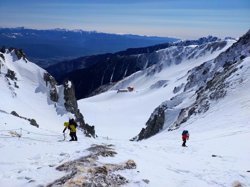 - カールの登りは急ですので、12本アイゼンとピッケルは必携です