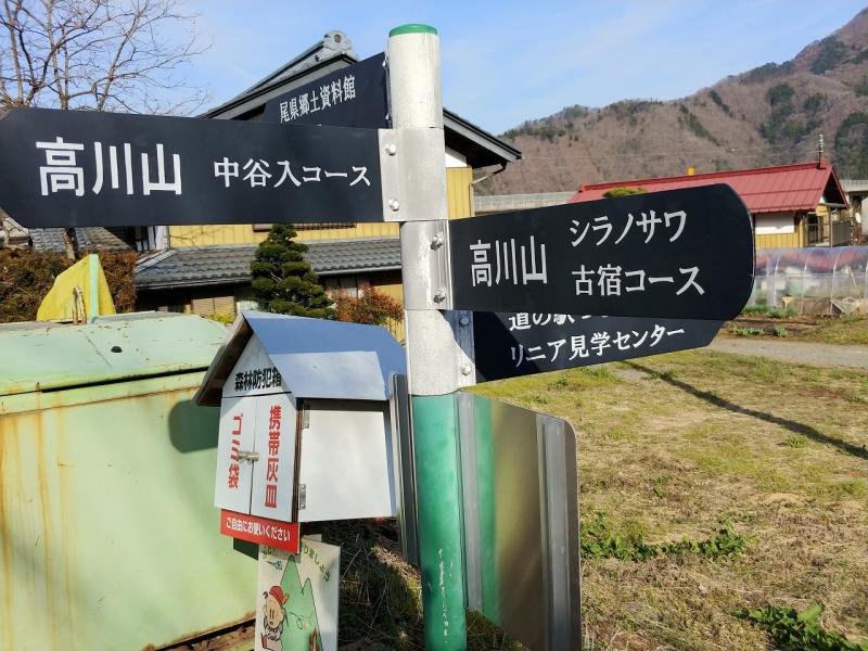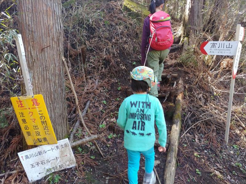 - 高川山登山口駐車場(45分)男坂女坂分岐(60分)男坂との合流地点(35分)高川山山頂(50分)古宿・小形山分岐(55分)林道出合(30分)リニア見学センター