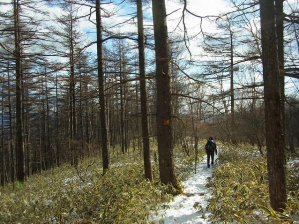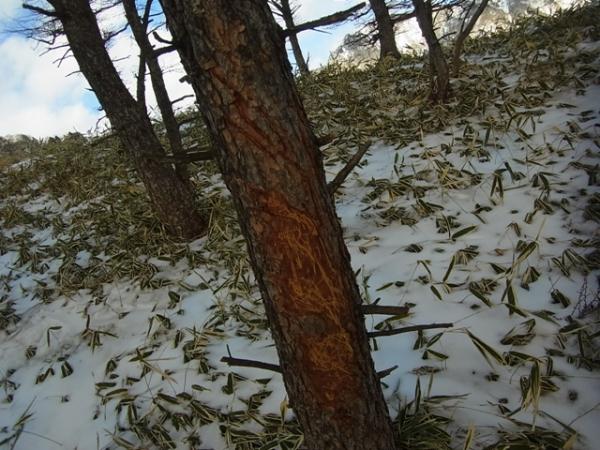 - 天狗尾根:踏み跡は、薄い。消える場所もあるので尾根での読図は必須。熊剥ぎがこの尾根にもあるので春以降は要注意。笹薮が多く、背は高くはないが足にまとわり付く場所が多く体力は取られます。