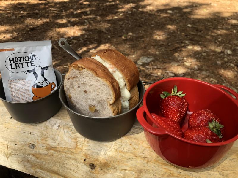 最近、山ごはんレシピの研究を怠っており、本日はコンビニで調達したポテサラをパン(バーナーでちゃんと炙りました!)に挟むだけという手の抜き具合。でもシンプルで美味しい。