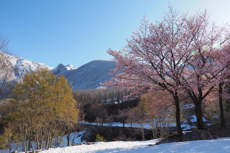 桜坂駐車場はまだ雪があって駐車できませんので西谷後バス停近くの分岐のスペースに車を駐車します。雪のある道路を歩いて登山口のある桜坂駐車場へ。桜坂駐車場では桜が咲いていました。山の上部は一面の霧氷が。さらに麓は新緑もあったので、雪山と桜と新緑が一緒に見られるとは♪昨日の雨は山では雪だったようで木々には霧氷と新雪が少し乗っていました。そのおかけで美しいブナの森の中を歩けました。木々は霧氷に覆われて青空に映えます。トレースは無くなっていましたが尾根を詰めていく感じなので登りは迷うことなく。井戸尾根はなかなかに急登なのと、気温が低いのでアイゼンが良く効きました。念のためピッケルも。少し開けてくるとニセ巻機山と白毛門からずっと続く県境稜線が見えてきます。辛い登りですが、青空と雪山に霧氷。最高という言葉しか出てきませんでした(笑)鳥の足跡が僕らを導いてくれました♫
