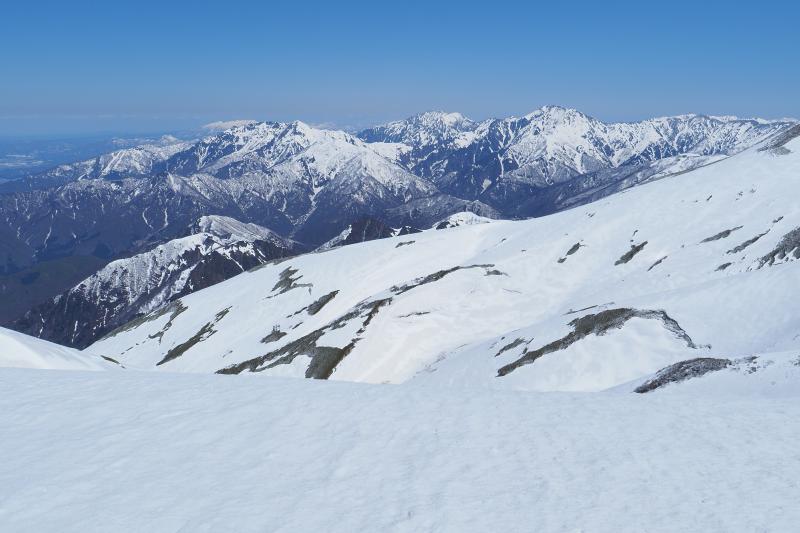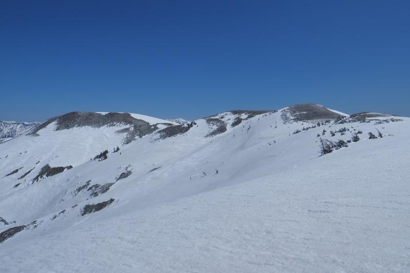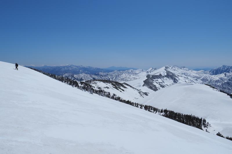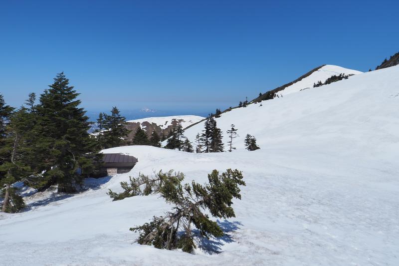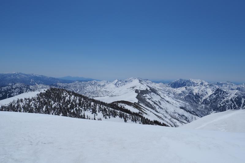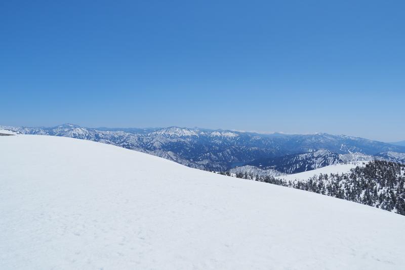 標高1600mくらいになると急に開けてニセ(前)巻機山手前のなかなかな急登がお目見え。無雪期は登ってるのでこのまだ先があるのも知っているので少し緩やかになったところで休憩しつつ、振り返って雪の谷川主脈稜線、馬蹄形の景色に見惚れます。日本海も見えました!ニセ巻機山手前の急登では雨氷が!でもクラックが入っているところもあるので気温上昇時は要注意です。少しトラバース気味に歩くところもあるのでアイゼンで蹴り込みます。そしてやっとニセ巻機山に到着。ちょっと風があるのでハードシェルを。目の前には巻機山が見えます。避難小屋に一旦下ってまた登り返し。2階建ての避難小屋がほぼ雪で埋まっているので積雪は5〜6mくらい?御機屋(頂上一帯)に出ると越後三山(八海山、越後駒ヶ岳、中ノ岳)が目の前に!そして10分も歩けば巻機山山頂。ケルンが目印です。会津駒ヶ岳から燧ヶ岳、至仏山、日光白根山、武尊山、そして白毛門・朝日岳からここ巻機山に続く群馬と新潟の県境稜線。ここは残雪期限定で歩いてみたいところ。そして谷川主脈、苗場山、妙高方面も見えていたはず。山が見え過ぎて山座同定できません(笑)