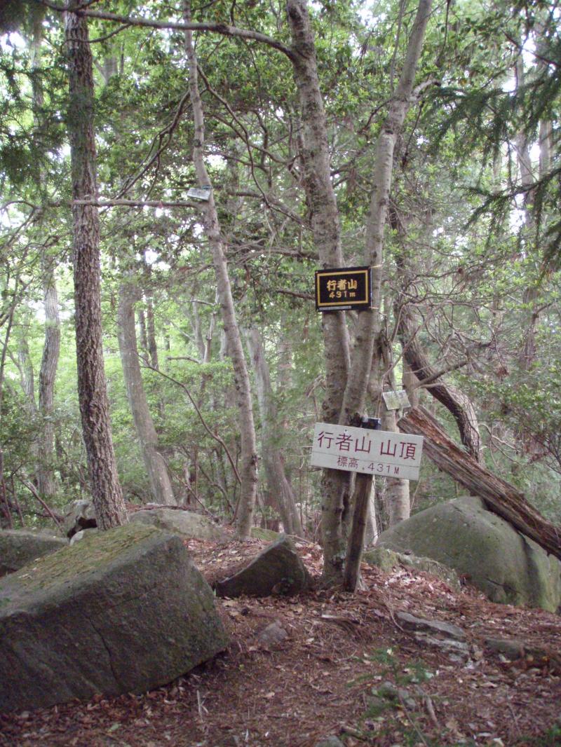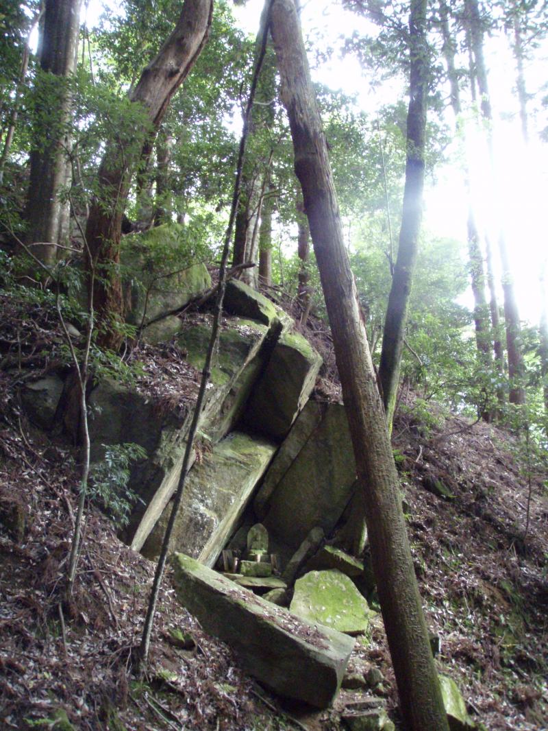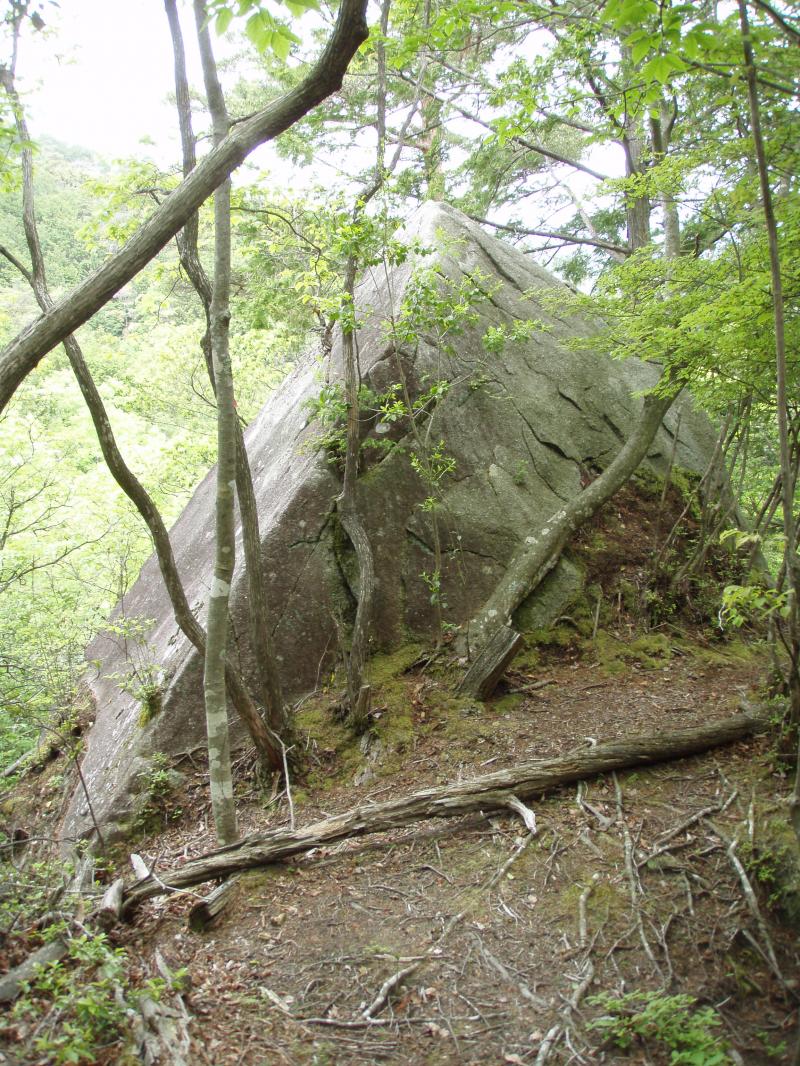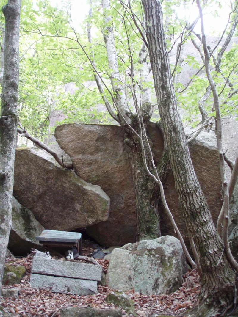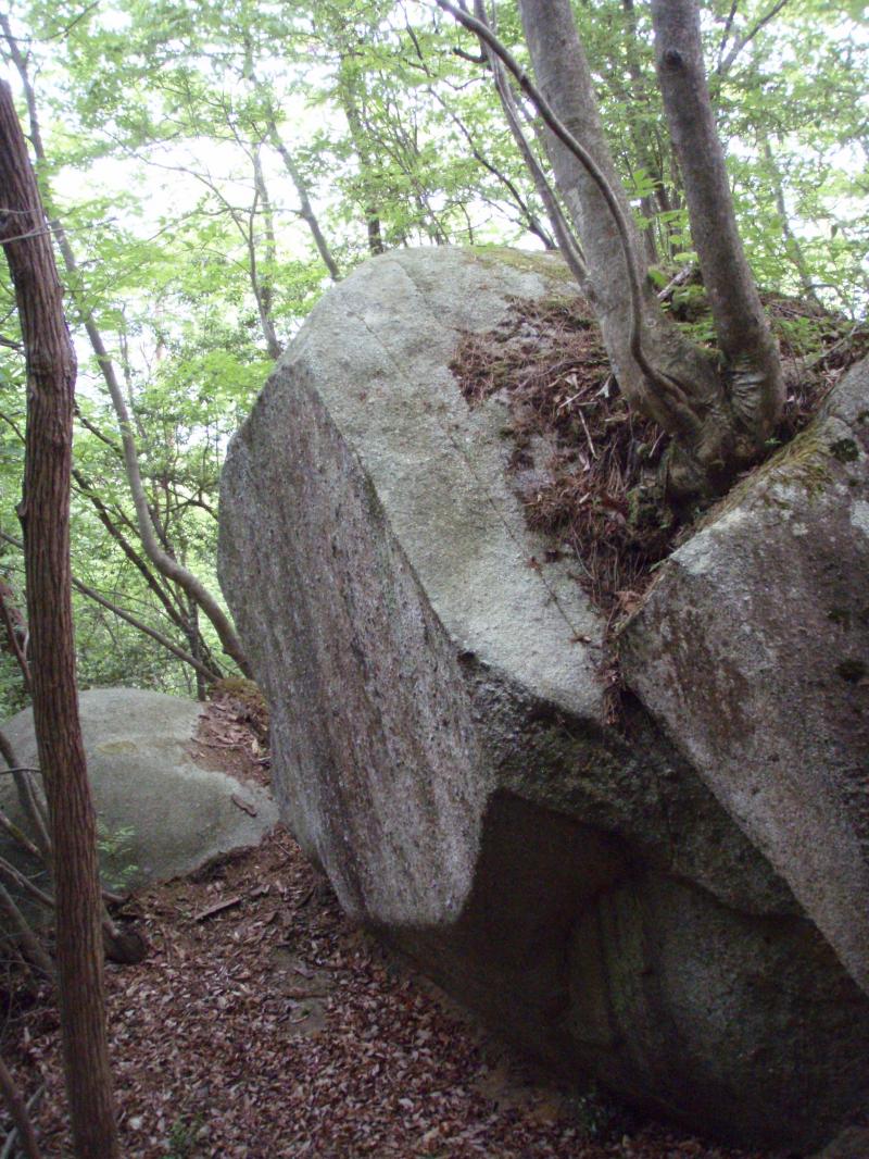 しばらく行くと千手寺に到着。南方向に展望有。しばらく進んで再び山道に戻ると、堂徳山を経由して行者山の山頂に到着。三角点あり。展望なし。行者山の見所は巨岩なので、さっそく巨岩巡りをしてみました。