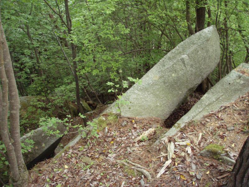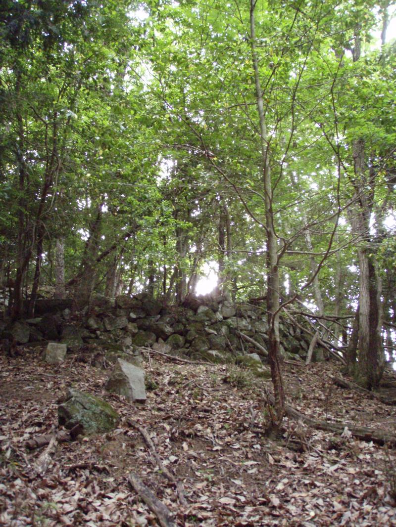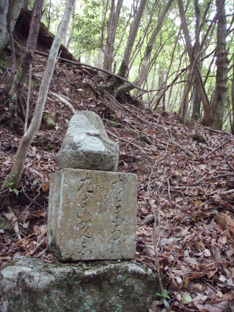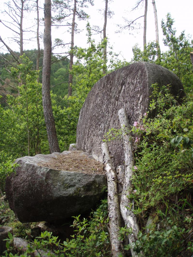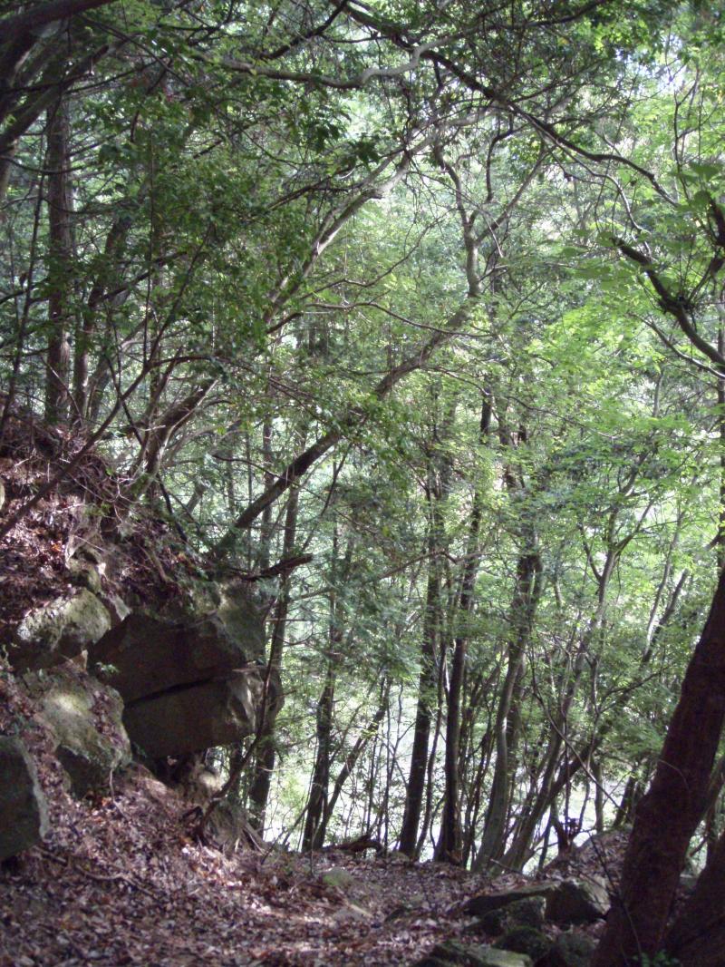 しばらく行くと千手寺に到着。南方向に展望有。しばらく進んで再び山道に戻ると、堂徳山を経由して行者山の山頂に到着。三角点あり。展望なし。行者山の見所は巨岩なので、さっそく巨岩巡りをしてみました。