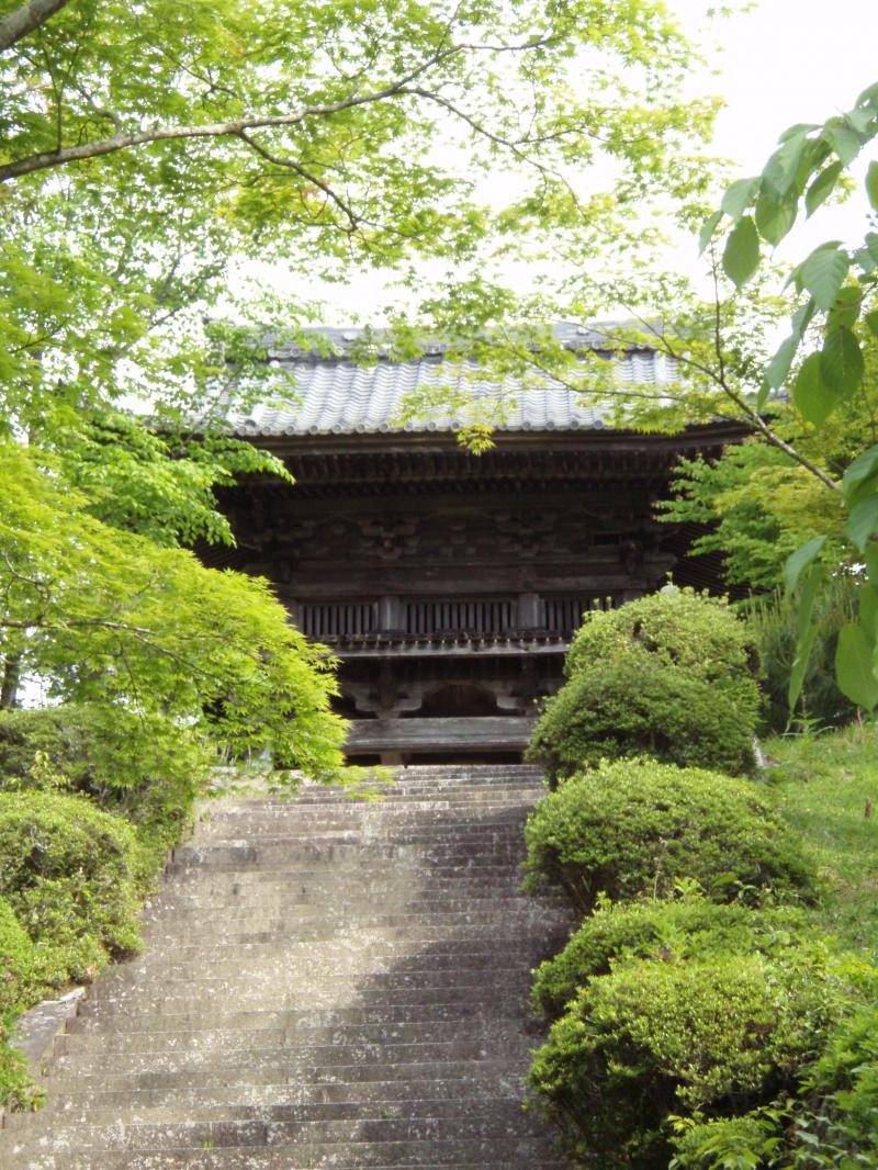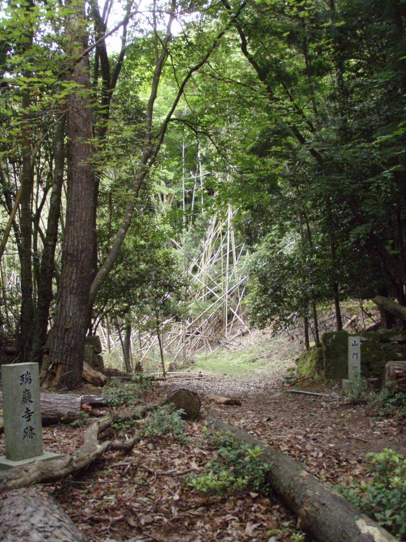 国道沿いにある無料駐車場・奥条ロードパークから出発。三密を避ける為、朝6時すぎの出発でしたが、薄曇りの為かちょっと肌寒かったです。獣除けの柵を抜け、竹林の中の道を進んでいくと、旧瑞厳寺跡に到着。周辺には石垣の跡などが残っています。