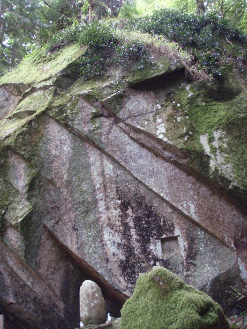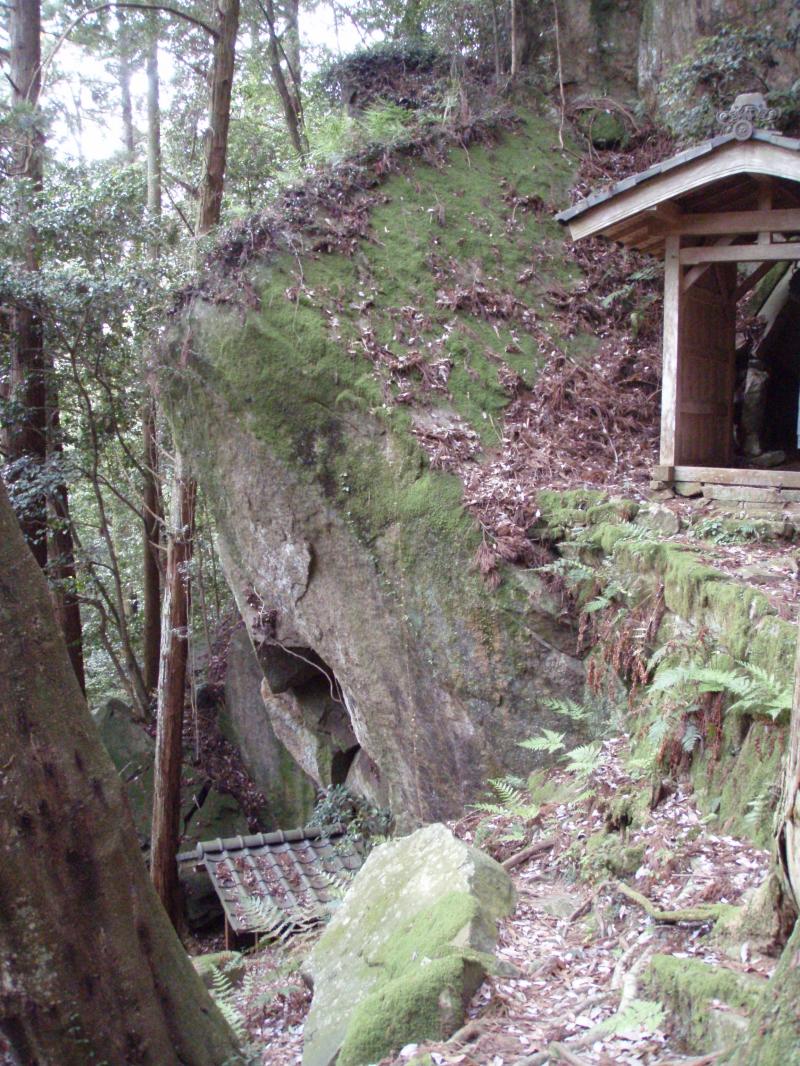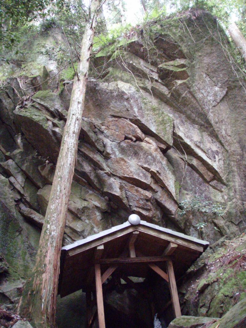 山頂からすぐ下に降りた所にあるのが、役行者を祀った「修験の行場」です。山頂から行くと逆コースになりますが、ここの巨大な岩は神秘的です。入口の鳥居まで15分弱。山頂に登り返しても往復30分ほどですので、一見の価値ありです。