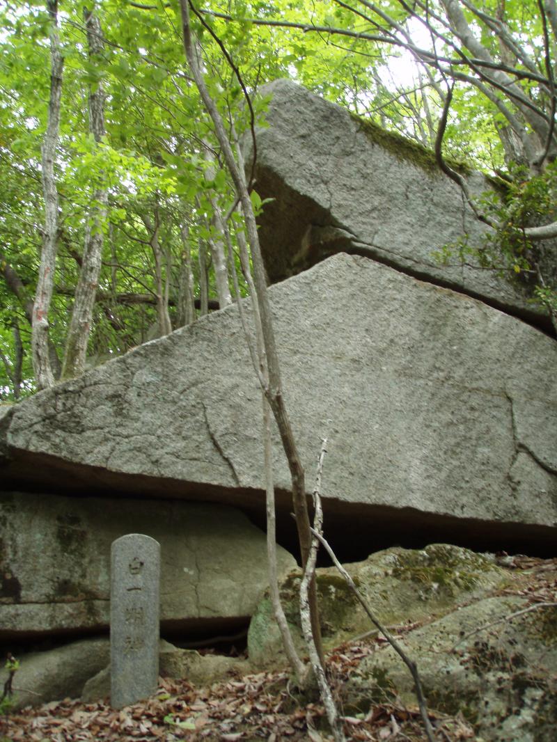 堂徳山へ向かう途中の左手に「神前 千手寺→」と書いた標識がある所から入るのが「白一明神」の岩場です。10分ほど急斜面を下ると、お稲荷さんを祀った祠と巨岩があります。この先は見所がないので、尾根道に引き返す方が良いです。