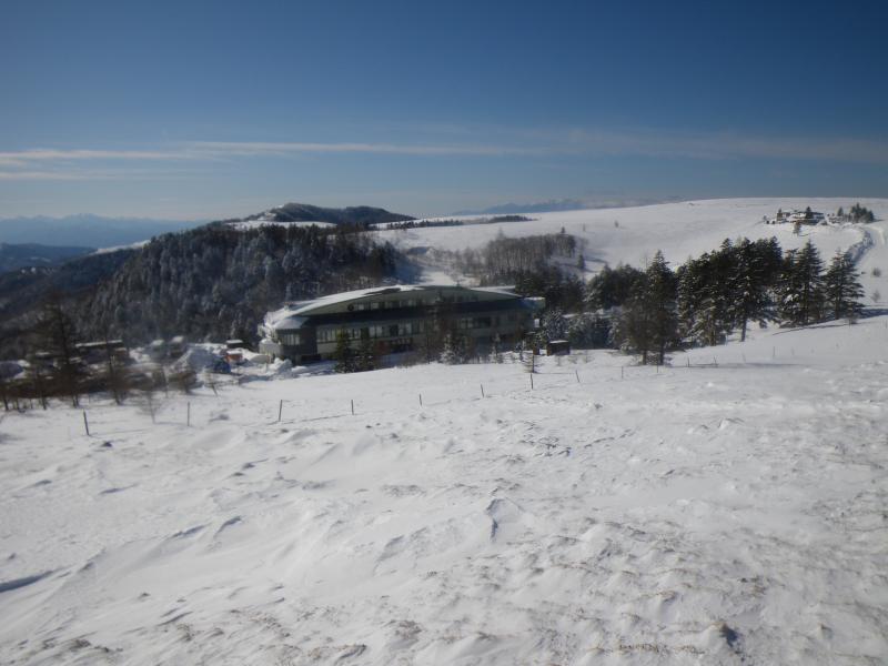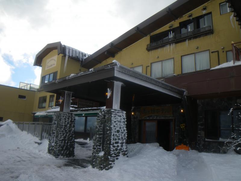 山本小屋~王ヶ頭までは雪上車が走ることもあり、雪の林道のような道がありますが、遠回りです。ここはスノーシューなので美しの塔からは適当に最短距離で進んでいきます。ある程度締まった雪なので、あまり沈まず快適です。一旦、窪みのような所を下がって、登り返しとなりますが、全くしんどいこともなくまさに快適なスノーシュー歩行。登りきると王ヶ頭ホテルは目前で再びブルドーザー道へのりひと登りです。高台にある王ヶ頭ホテルからは美ヶ原の台地、遠くに浅間山や富士山が見渡せますが、なんと雄大なことか。それにこの位置にあるこの王ヶ頭ホテルはすばらしいと実感できます。次はぜひ泊まってみたいと思います。