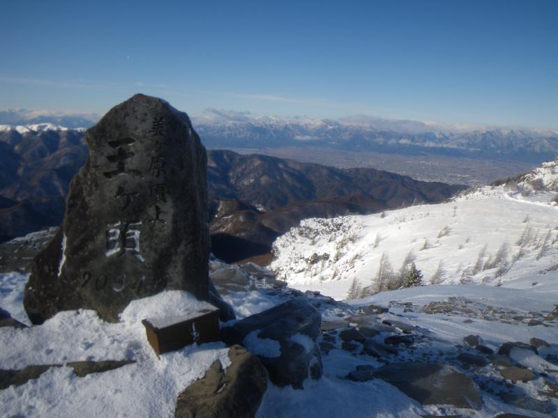 王ヶ頭から折り返しで今度は牛伏山へ向います。見えていますが、距離はそれなりありますが、また最短距離で縦断し一気に美しの塔へ進み、ブルドーザー道と並行に左上しながら牛伏山へ登ります。ここまで道を無視して歩いてきましたが、ここからは夏道と思われる箇所を進んでいきます。夏のロープがありますのですぐにわかります。牛伏山は牛伏山園地という展望台のような箇所が山頂ですが、山というより丘でした。今年の干支の山で最もすぐに行ける山だと思います。展望はもうあちこちで同じような風景を見ているのであまり新鮮さはありませんが、王ヶ頭が遠く感じました。