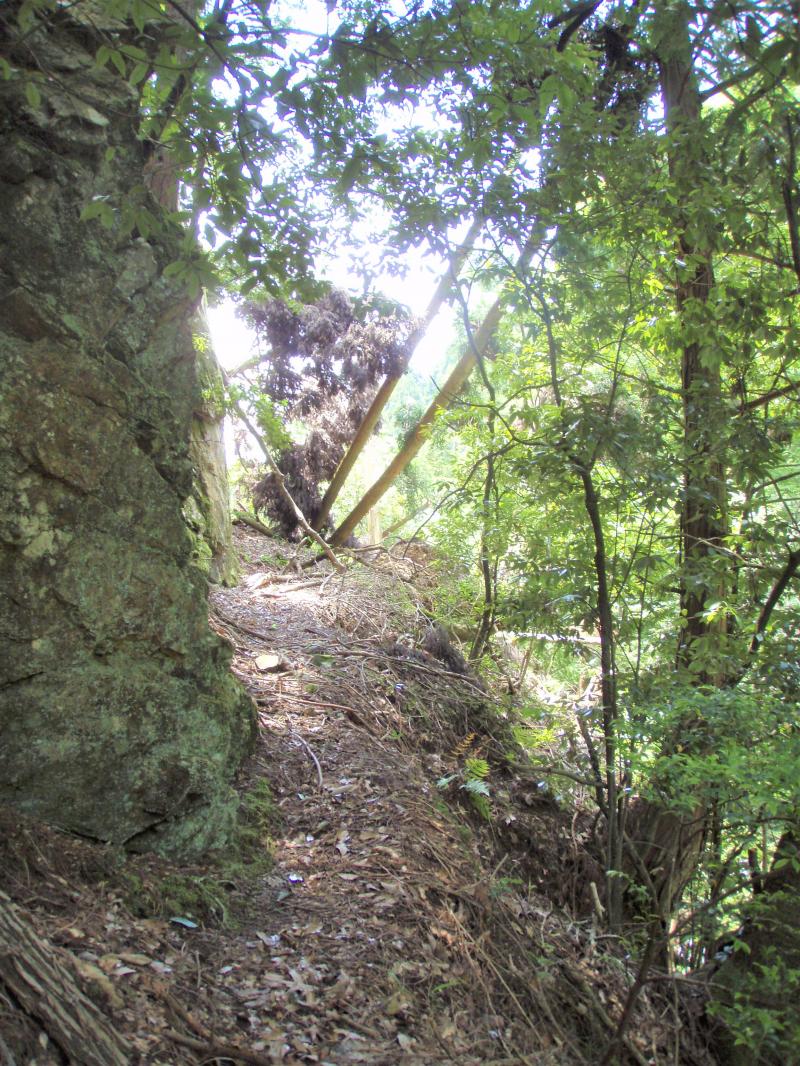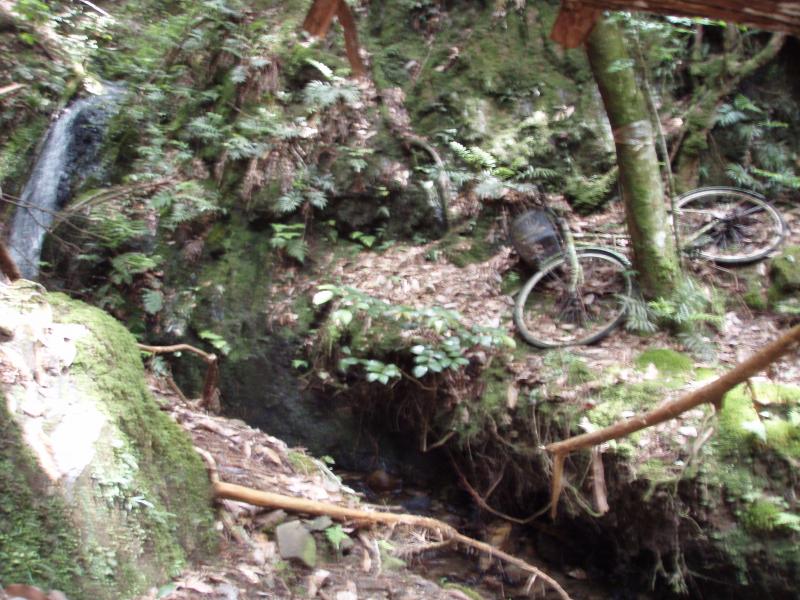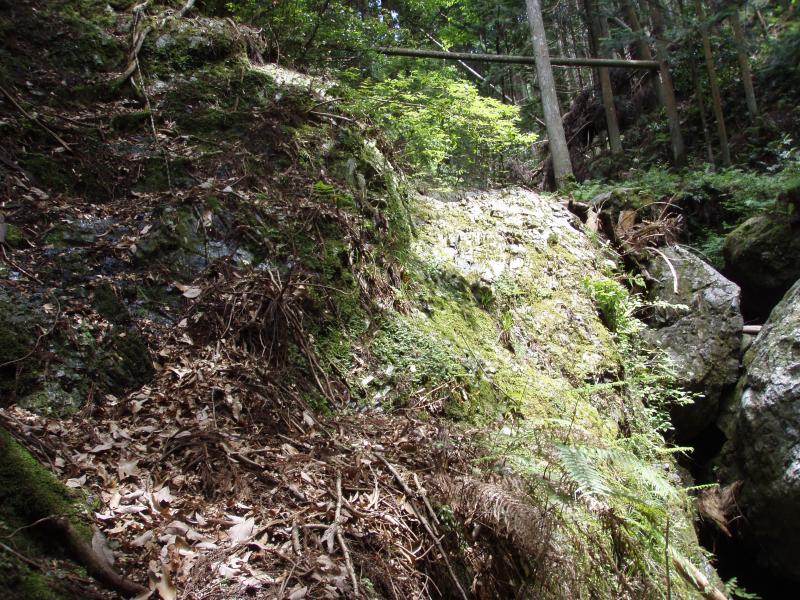 登山道に戻り、さらに道なりに進んでいくと、先ほどの滝の上部で道が極端に狭くなりますので、ご注意ください。そのまま進んでいくと、右岸に乗り捨てられた自転車が放置されています。車輪に付着物がなく、前カゴも変形していない事から、流されてきたとは考え難いのですが、後ろは15mの滝、その先の登山道もロープで岩場を上り下り、沢には小滝がたくさん…普通の自転車で一体どうやってここまで来れたのか謎です。