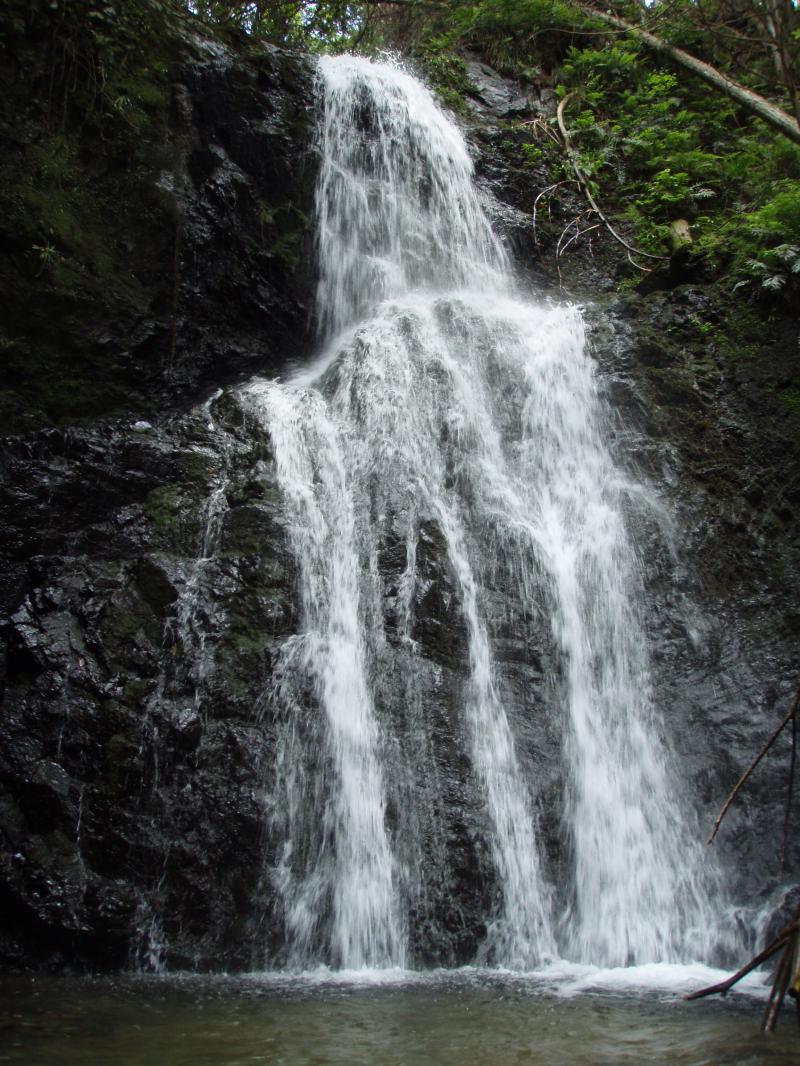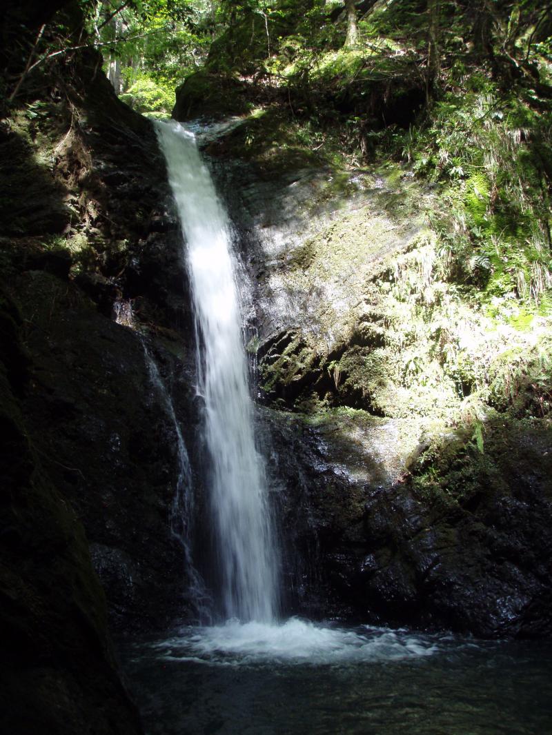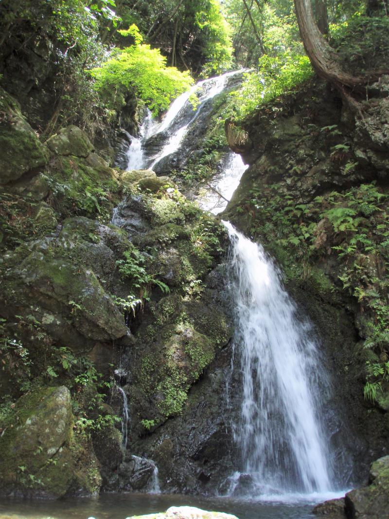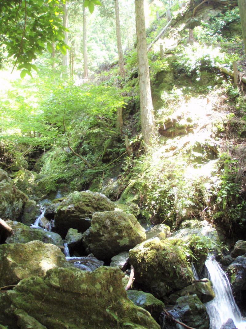 今回は沢登りではなく「滝巡り」なので、バス停から北に200mほど行った所にある登山口から入山。鬱蒼と茂った草を掻き分け、手すりのある登山道を登っていくと、左手が岩壁の崖っぷちの道が続きます。登山口から約35分で、沢までロープが設置されている場所に到着。このロープを伝って急斜面を10数m下降すると落差15mほどの二段滝に降りられますが、細いロープを数分間握り続ける握力とバランス感覚を必要とする上級者向けコースになります。