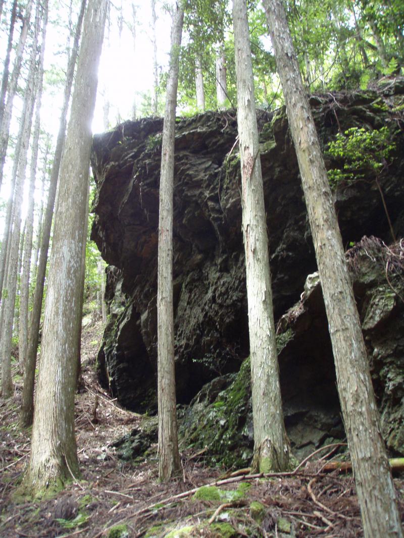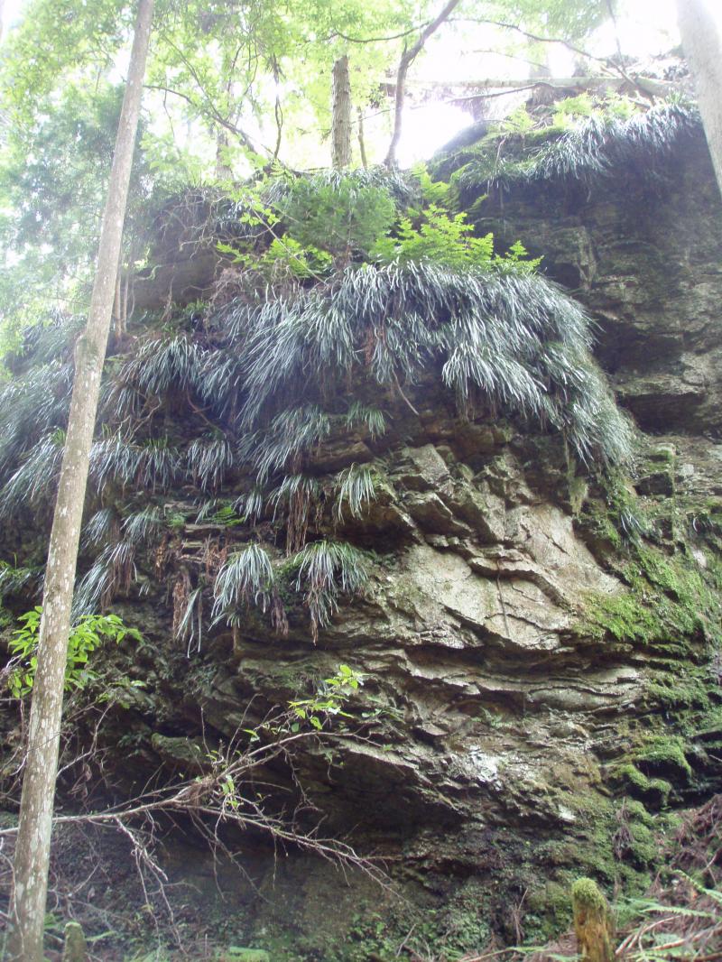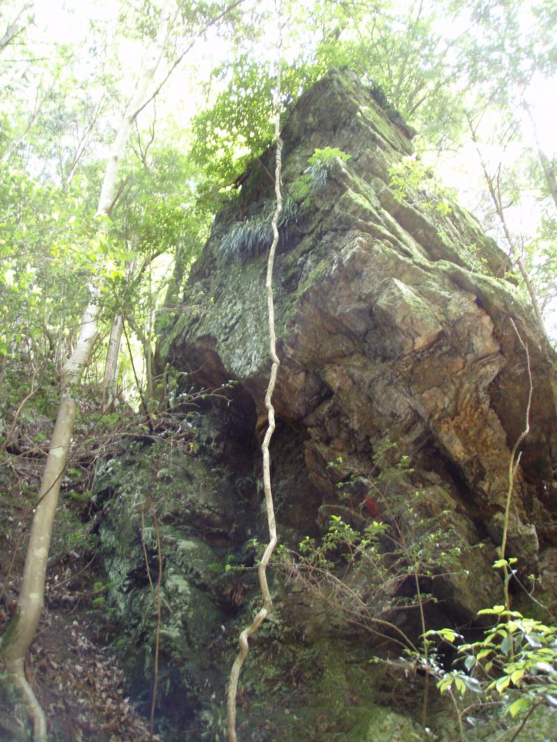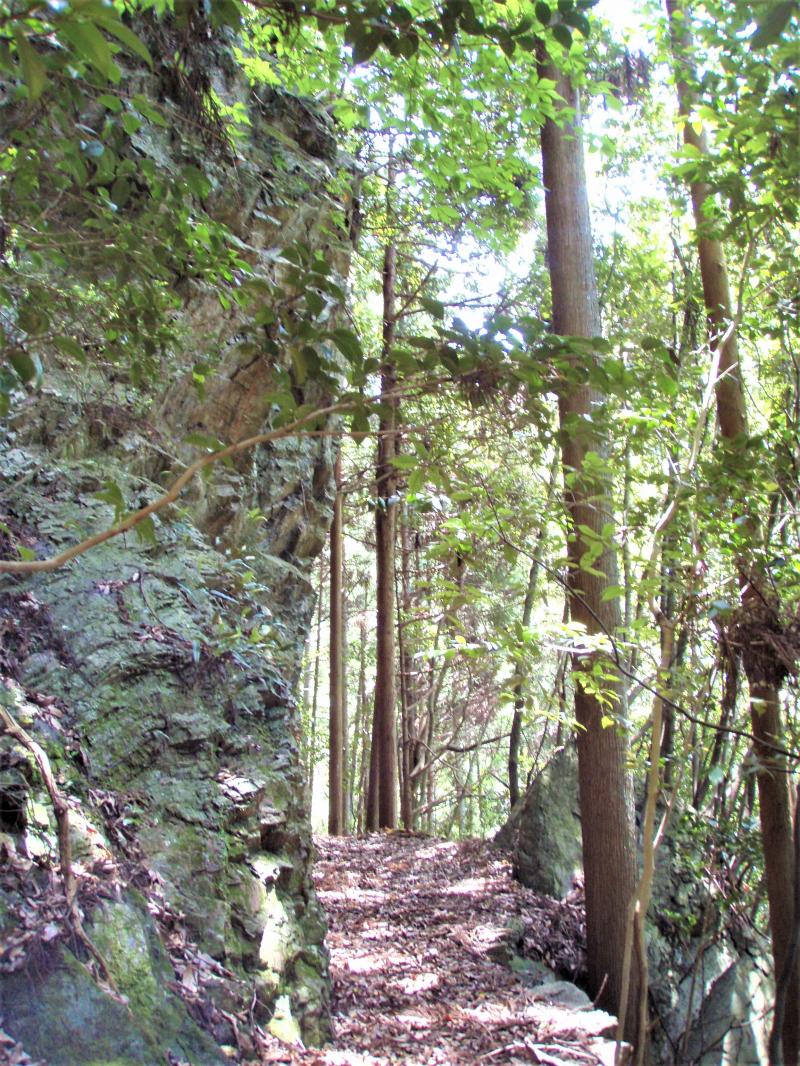 今回は沢登りではなく「滝巡り」なので、バス停から北に200mほど行った所にある登山口から入山。鬱蒼と茂った草を掻き分け、手すりのある登山道を登っていくと、左手が岩壁の崖っぷちの道が続きます。登山口から約35分で、沢までロープが設置されている場所に到着。このロープを伝って急斜面を10数m下降すると落差15mほどの二段滝に降りられますが、細いロープを数分間握り続ける握力とバランス感覚を必要とする上級者向けコースになります。