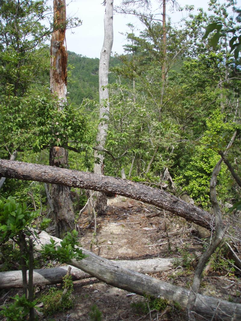 右岸から左岸に渡り、沢から離れて少し上った所で、最後の滝が見えてきますが、この辺りは多数の倒木があり通過に時間がかかりました。降りる道がガレていた為、登山道から沢への下降には用意したロープを使用。この滝が落差10mほどの「毘沙門滝」のようです。