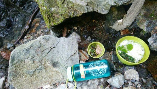 峠に下り、滝に下りました。六甲の秘境ですねえ。川で冷えた素麺で一服です。里のお世話になった方からの「小豆島素麺」ミョウガ、ミズ、ワラビとわさびを添えて頂きました。満腹です。