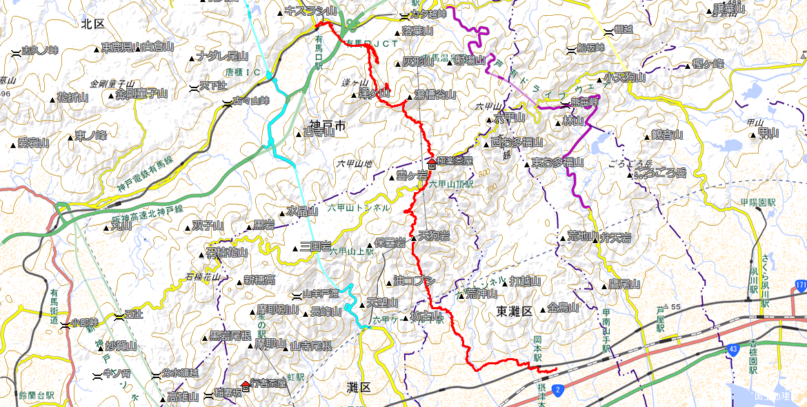 - 神戸電鉄・有馬口駅 8:00 登山口 8:30 鬼ヶ島 水無峠 ~水無滝 ~ 水無峠10:55~湯槽谷山~番匠屋尾根 ~極楽茶屋 13:00~ 天狗岩南尾根 ~渦が森~14:00 阪急岡本14:50 フロイン堂 → 六甲 「白馬堂」
