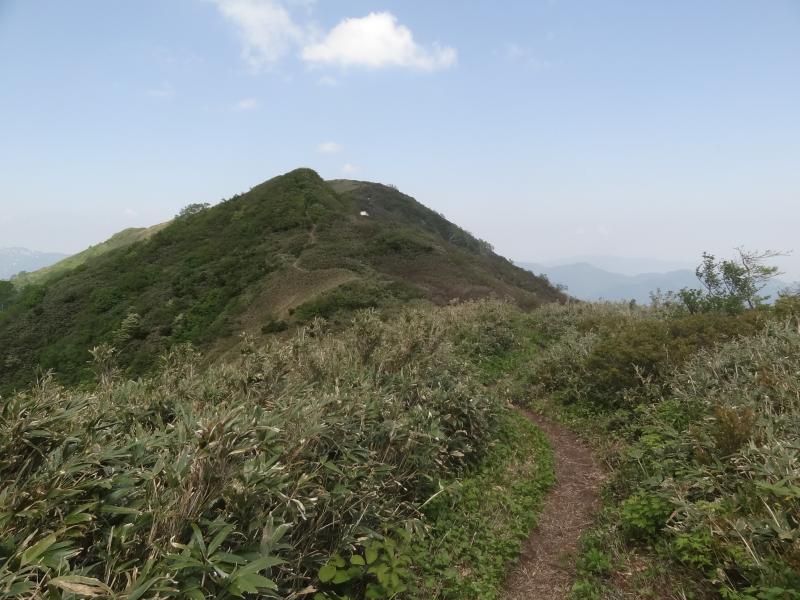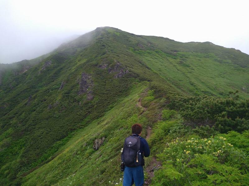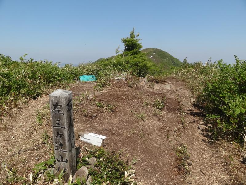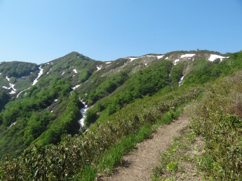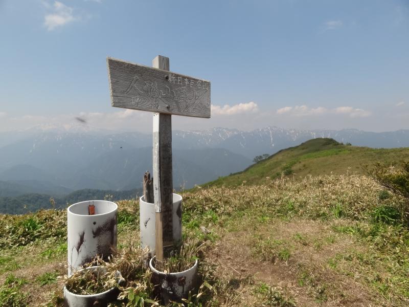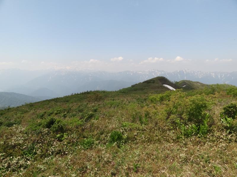 分岐から人形山へはやや道がよく、こちらは白山を見ながらの草原のような稜線歩きで、三ヶ辻山より歩きやすく足早に進めます。山頂と近くの草原のような草地からは360度のパノラマでまだ雪が残る白山連峰がしっかり見渡せます。この景色を見るとやはりこちらが三百名山なのだなと思います。もう6月ですが、花も咲いているのでハエが多く、稜線では直射日光で暑い日でした。ニュースで白川郷は今年一番の暑さで30度越えでしたので、どうりで暑かったこと。登山口の水場の水が冷たくで気持ちよかったのが印象に残ります。なかなかいい山でしかも季節もよかったと思います。