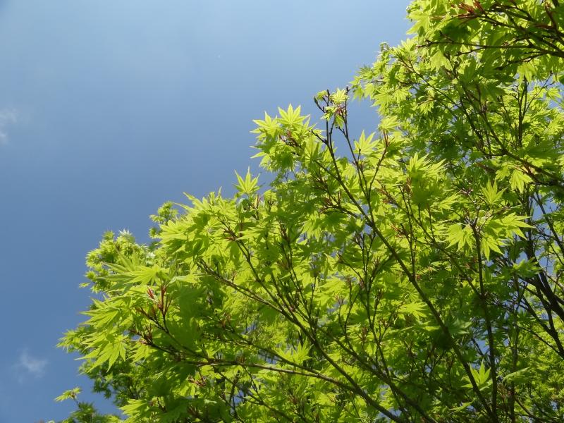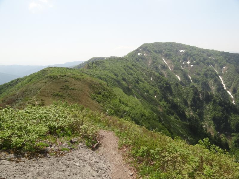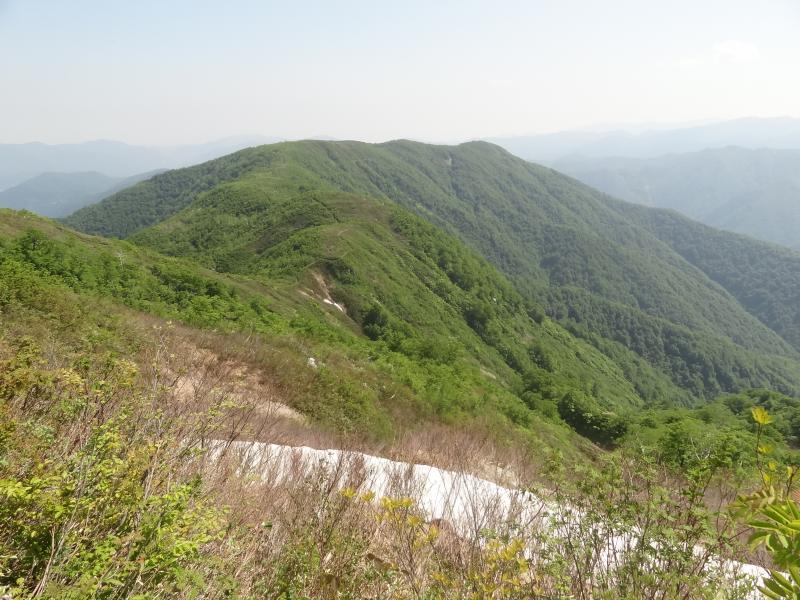 毎年6月第一日曜日(今年は6月6日)に山開きが行われ、今年は特に登山客があふれていたとのことですが、今日はその後の平日で結局4組程度で、下山にかかる頃に登山客とすれ違うくらいでした。車で800mの中根平まで入れますが、まだ900m近く標高を上げなくてはなりません。しかしながら最初の第一休憩所までは傾斜のゆるい快適な登山道なのでウォーミングアップ。この先はブナ林が増え、徐々に傾斜が増していきますが、宮屋敷跡でぱっと展望が開け、少しだけ残雪が残る山肌と新緑が青々して晴々です。右に人形山、左に三ヶ辻山が見えますが、形は三ヶ辻山の方が三角錐に見え、こっちの方が人形山かと思わせます。続いて、両山の分岐まで来ましたが、今度は白山連峰が正面にしっかり見え、スケールの違いがわかります。長そうな三ヶ辻山を先に済ませることにしますが、
