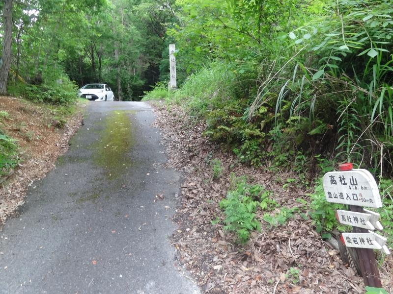 ①県道沿いに登山口の看板がありますが、わかりにくいです。高社神社参道入口の鳥居前に3台程度の駐車スペースはありますが、路肩があまりなく県道沿いはむずかしい