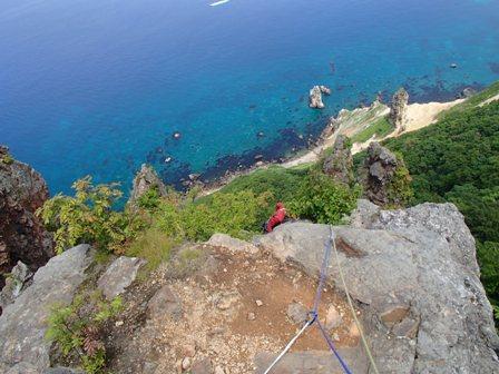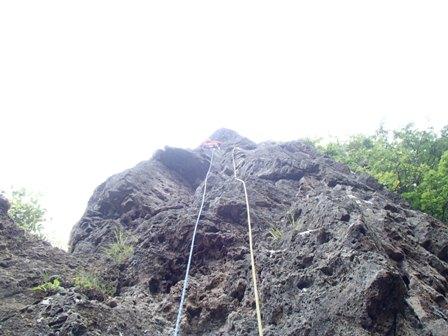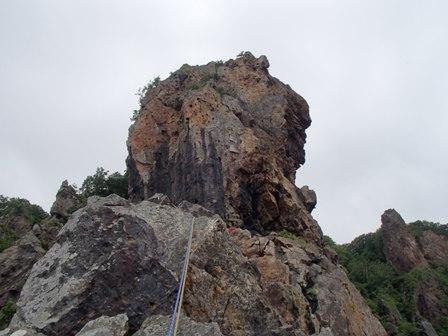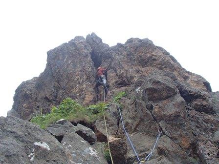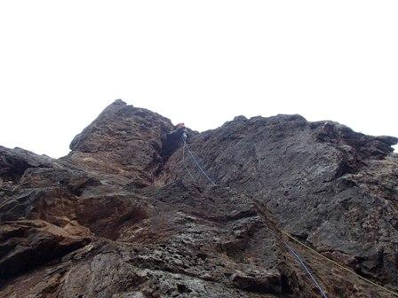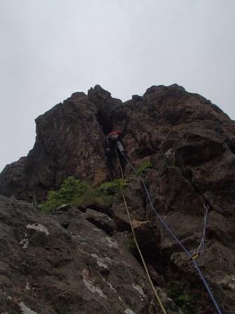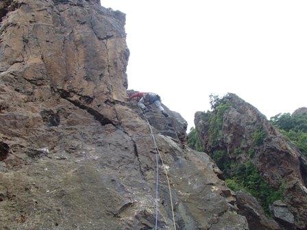 再び霧雨模様になってきたが、とりあえずマルチを1本は登ろうと、定番のテーブルへと。ここからは“つるべ”でのぼり、1,3ピッチを小山田、2,4ピッチを石渡さんがリード。最終ピッチの頃には晴れ間も見えたりと気持ちの良いクライミング。