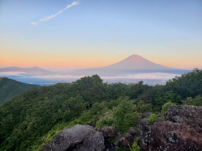 コースタイムだけでみると7時間強かかるということで、早く登り始めないと駐車場に止めたバイクを回収しに行くバスの時刻が間に合わなくなってしまう...。折角早くに登るなら綺麗な朝焼けの富士山を見ようと思い、深夜から登り始める事に。深夜2時ごろに家を出発して駐車場に着いたのが3時半ごろ。この日の日の出の時刻は4時40分ごろなので、遅れないように登りました。久々のナイトハイクだったので時たま聞こえる虫や動物の鳴き声、木の折れる音などがこわいこわい(笑)それもあって急ぎ足で登ること1時間、山頂に到着!山頂直下で一人抜いた以外は人に会う事は無く、金時山のような人気の山でも静かな山頂でした。登った後に知ったのですが、赤く綺麗に焼ける富士山を見るなら夏の終わりから秋の始めの時期のようで、真っ赤に染まったとまではいきませんが、朝焼けの富士山は見ることが出来たので一つ目標は達成です。山頂で朝ごはんを食べた後、明神ヶ岳へ向けて出発!稜線部の背の高い笹原を歩くのはとても気持ちが良いですね!基本的に整備された登山道が続くので歩きやすく、思ったより早く歩くことが出来ました。ただ、明神、明星方面へ歩くにつれてすれ違う人も少なくなり蜘蛛の巣が体や顔に引っかかり悲しくなりました...。降りてからは箱根の温泉に浸かり、まったりしてから帰りました!次回登るタイミングがあれば今度こそ真っ赤に染まった富士山が見てみたいですね!