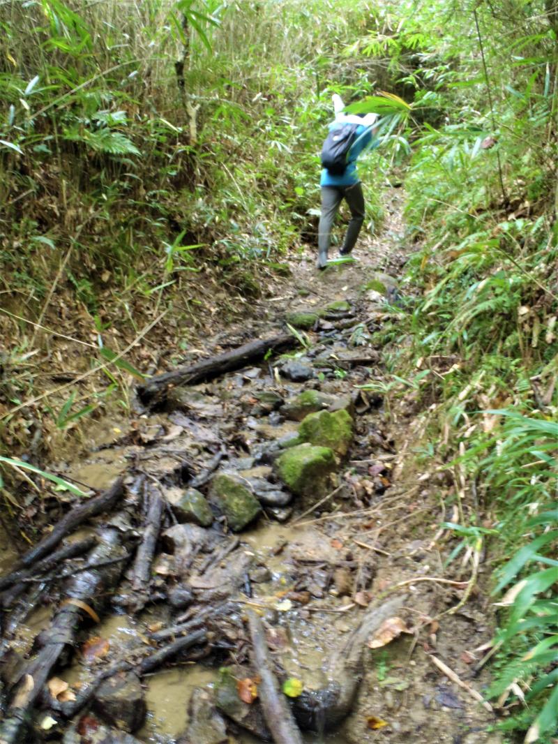 - 信貴越え(黒谷道)は、ぬかるんだ道で藪漕ぎ。