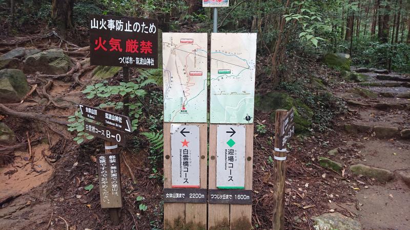 - 筑波山神社-(5分)-宮脇-(70分)-男女川源流-(30分)-御幸ヶ原-(20分)-女体山-(40分)-弁慶茶屋跡-(50分)-迎場コース分岐-(15分)-筑波山神社