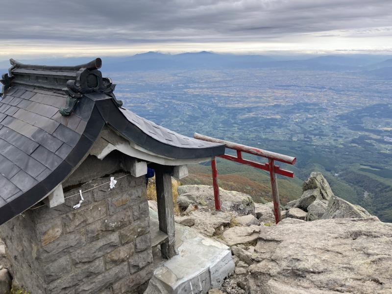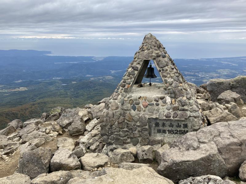 山頂では津軽平野が一望できます!岩がゴロゴロしていますが、休憩にはちょうどいいでしょう。山頂には避難小屋もあります。